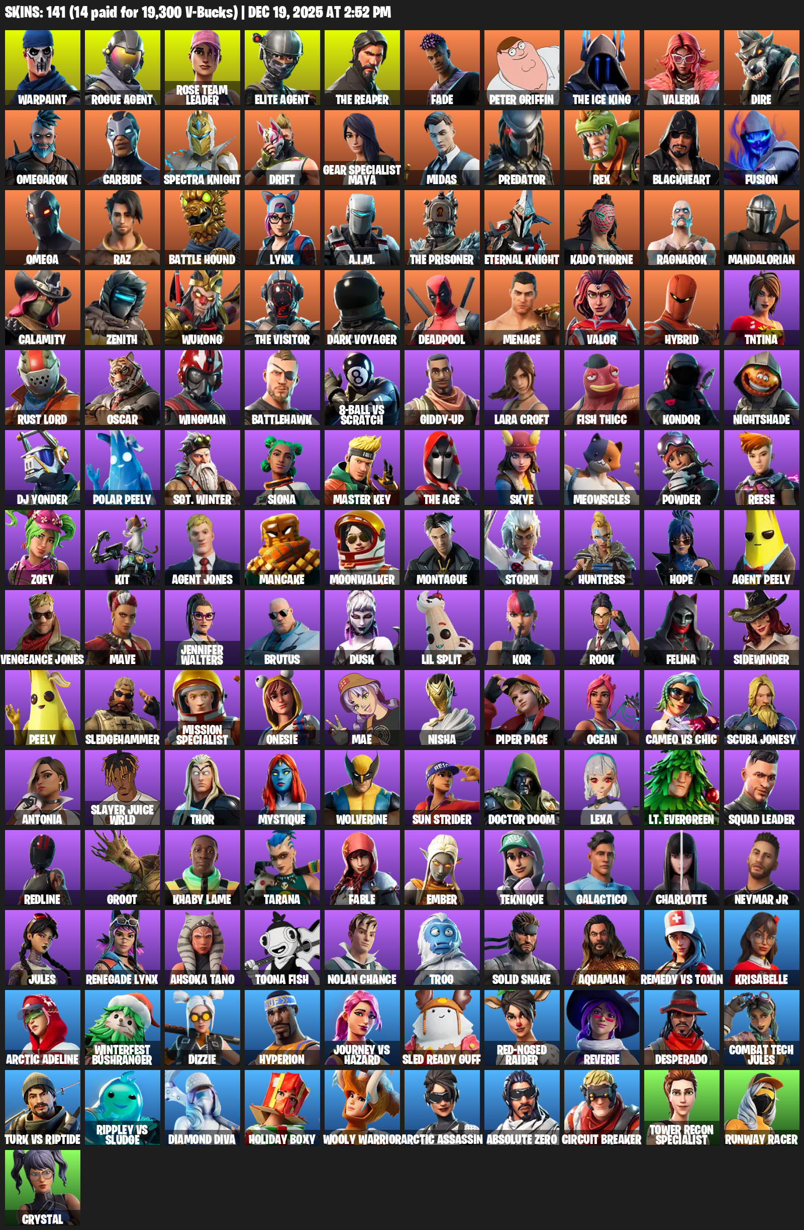 Elite Agent, The Reaper, Gear Specialist Maya, Omega, Lara Croft, Warpaint, Rose Team Leader, Fade, Peter Griffin, Valeria, Dire, Omegarok, Carbide, Spectra Knight, Drift, Midas, Predator, Rex