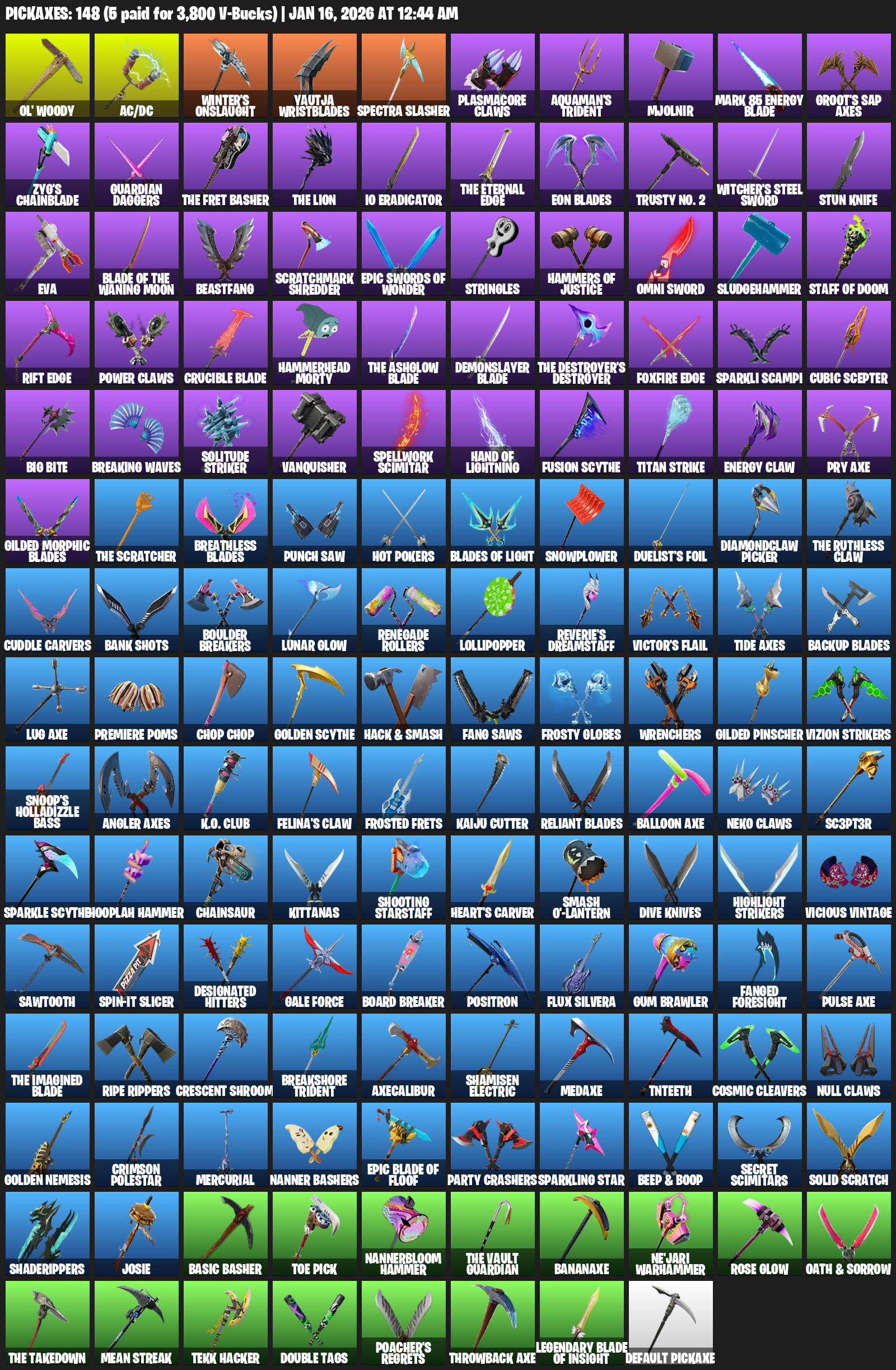 Ol’ Woody, AC/DC, Winter’s Onslaught, Yautja Wristblades, Spectra Slasher, Plasmacore Claws, Aquaman’s Trident, Mjolnir, Mark 85 Energy Blade, Groot’s Sap Axes, Zyg’s Chainblade, Guardian Daggers, IO Eradicator, Eon Blades, Trusty No. 2, Witcher’s Steel Sword, Stun Knife