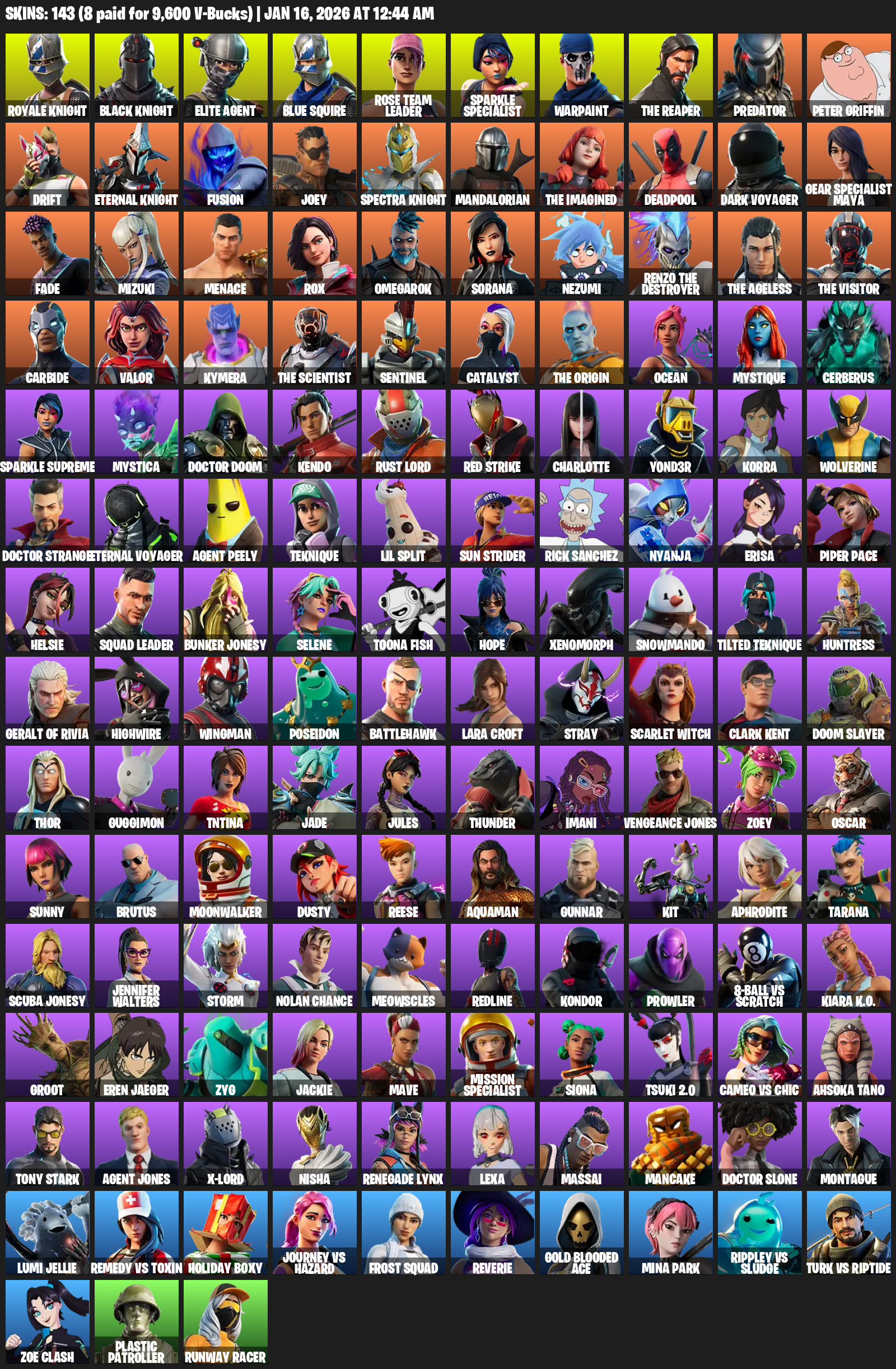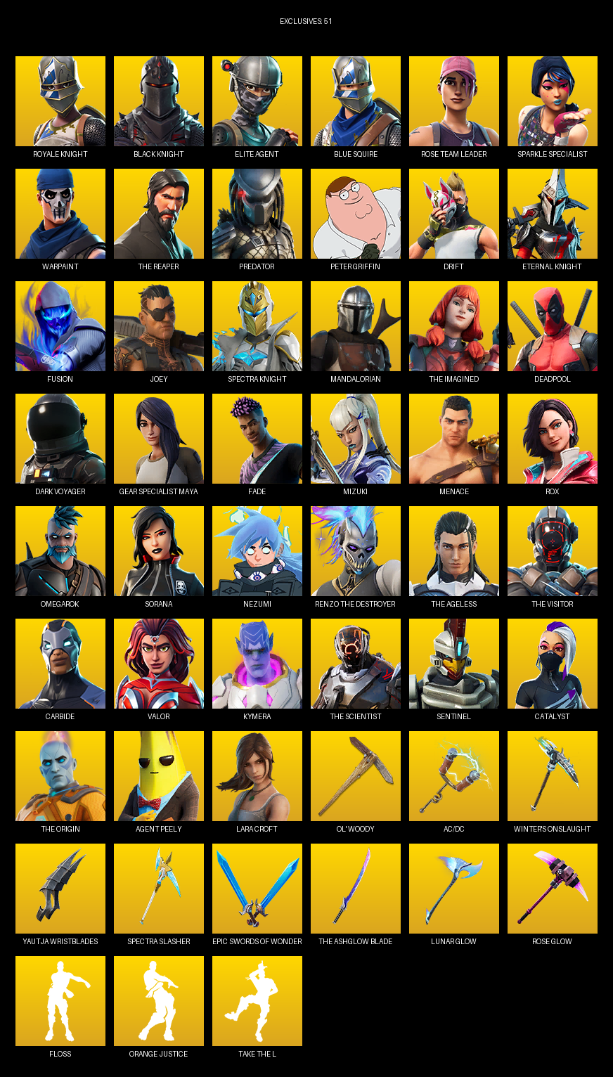Royale Knight, Elite Agent, Blue Squire, Sparkle Specialist, The Reaper, Lara Croft, Rose Team Leader, Warpaint, Predator, Peter Griffin, Drift, Fusion, Joey, Mandalorian, Deadpool