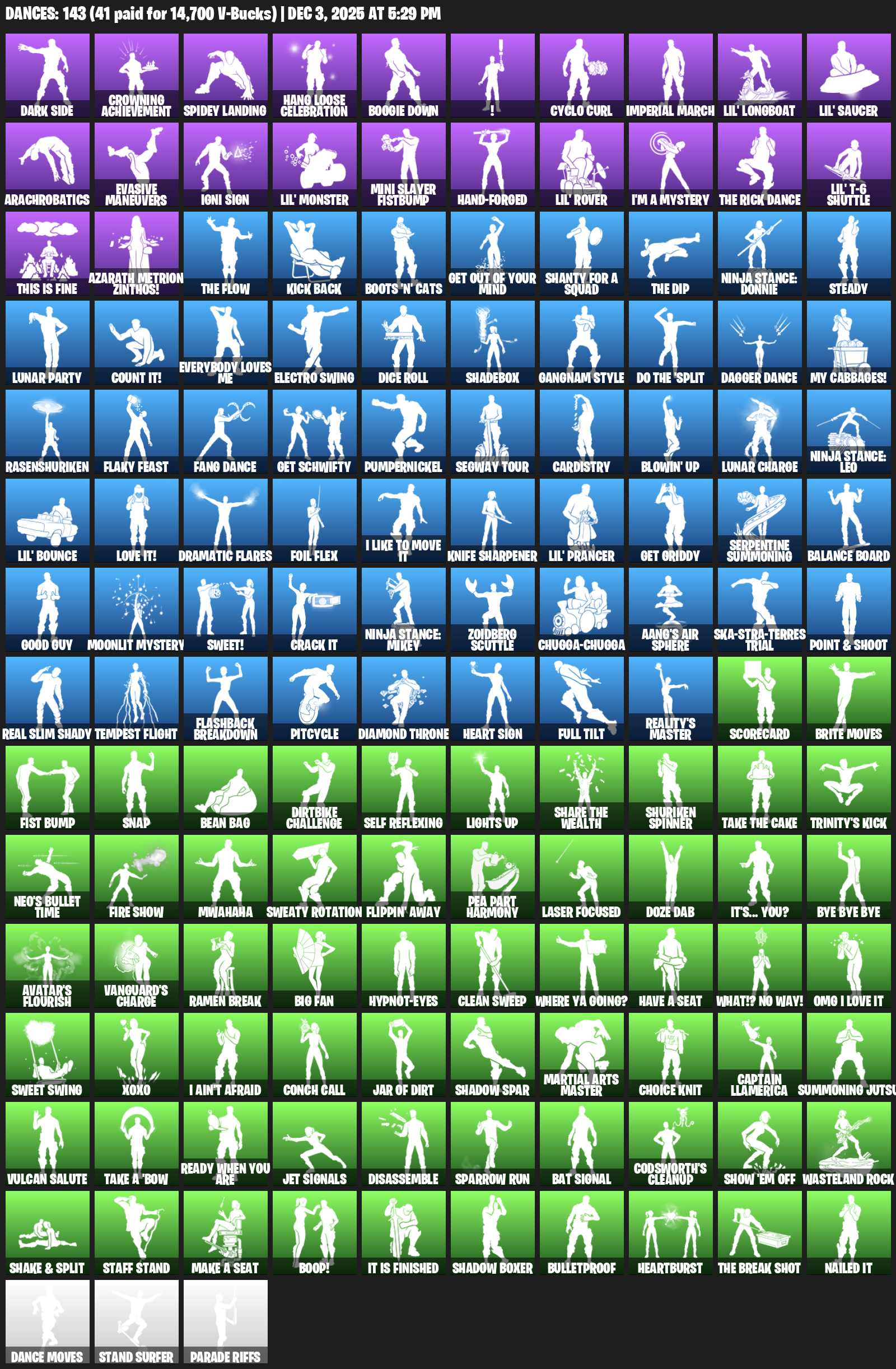 Dark Side, Crowning Achievement, Spidey Landing, Hang Loose Celebration, Boogie Down, !, Cyclo Curl, Imperial March, Lil’ Longboat, Arachrobatics, Evasive Maneuvers, Igni Sign, Mini Slayer Fistbump, Hand-Forged, I’m a Mystery