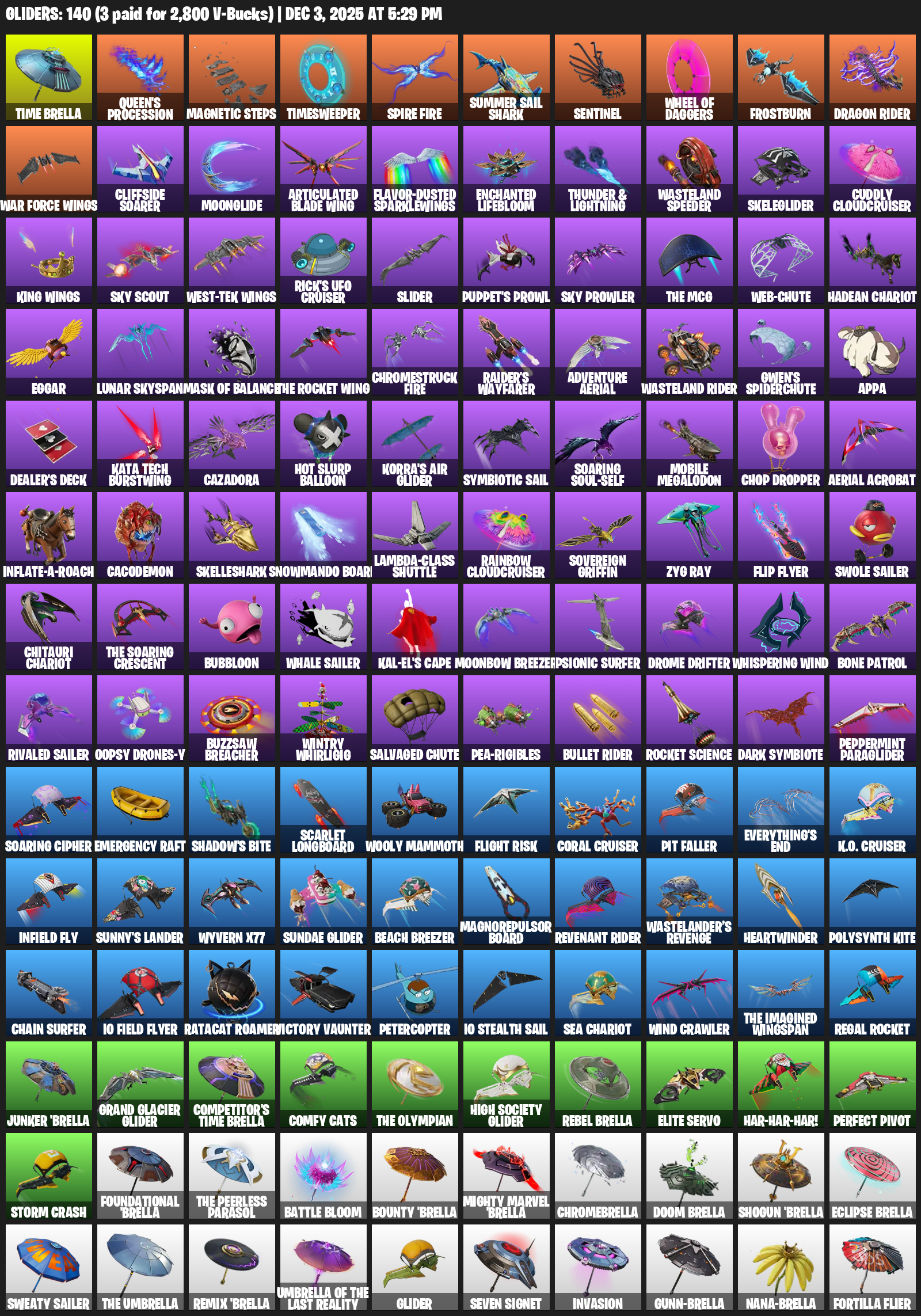 Time Brella, Queen’s Procession, Magnetic Steps, Timesweeper, Summer Sail Shark, Sentinel, Frostburn, War Force Wings, Cliffside Soarer, Moonglide, Articulated Blade Wing, Flavor-Dusted Sparklewings, Enchanted Lifebloom, Thunder & Lightning, Wasteland Speeder, Skeleglider, Cuddly Cloudcruiser