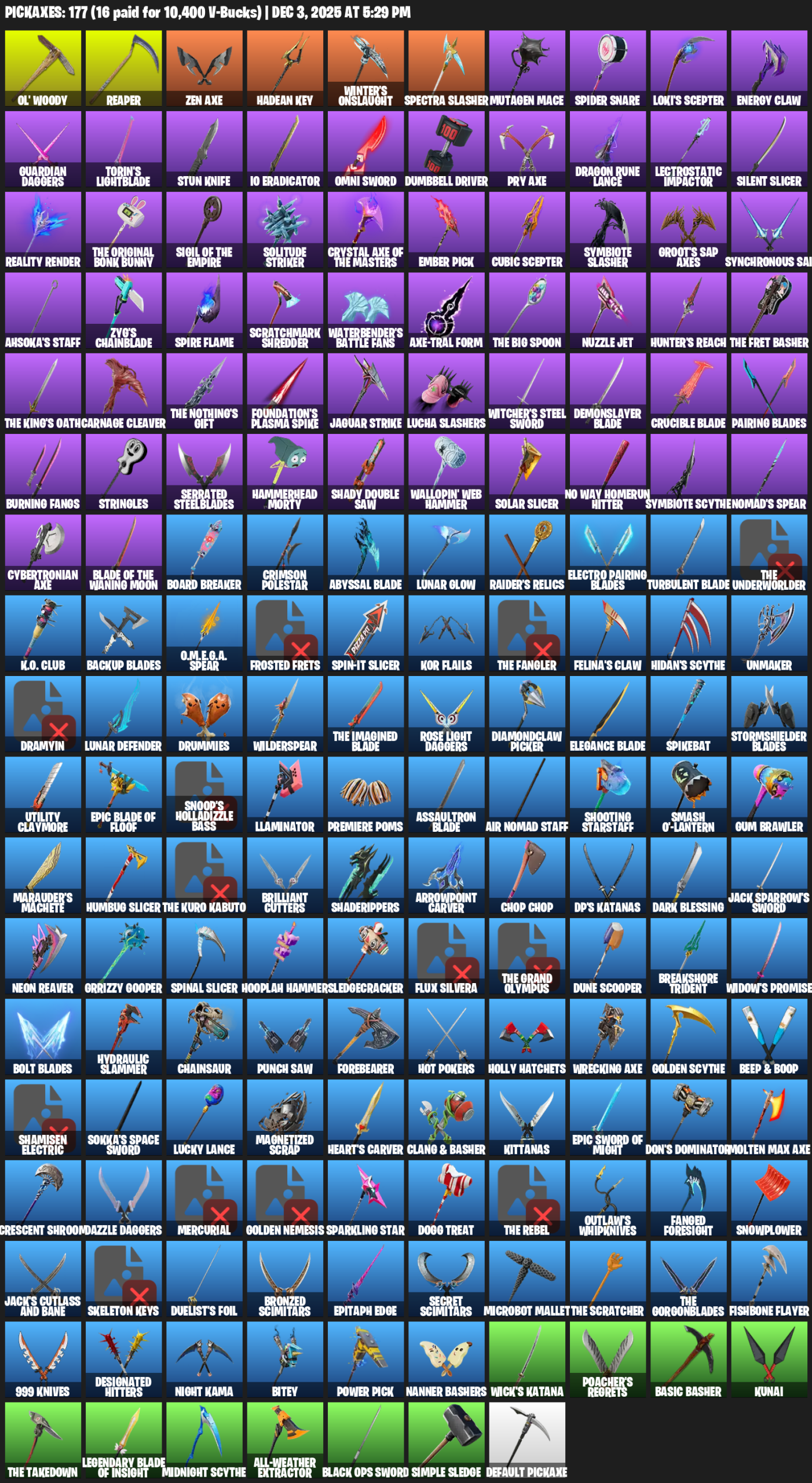 Ol’ Woody, Reaper, Zen Axe, Hadean Key, Winter’s Onslaught, Mutagen Mace, Spider Snare, Loki’s Scepter, Energy Claw, Guardian Daggers, Torin’s Lightblade, Stun Knife, IO Eradicator, Omni Sword, Dumbbell Driver, Dragon Rune Lance, Lectrostatic Impactor, Silent Slicer