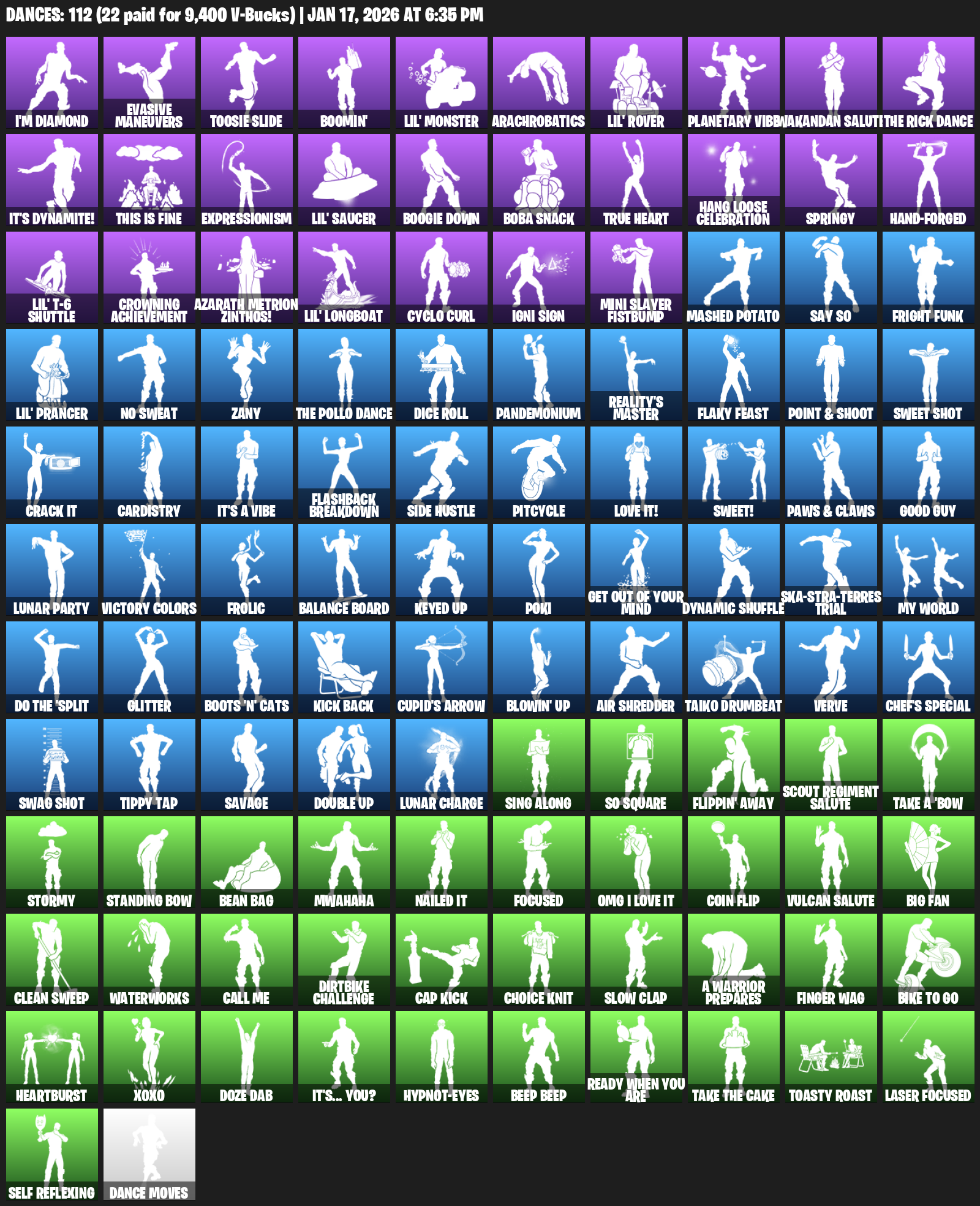 I’m Diamond, Evasive Maneuvers, Toosie Slide, Boomin’, Lil’ Monster, Arachrobatics, Planetary Vibe, Wakandan Salute, It’s Dynamite!, This is Fine, Expressionism, Boogie Down, Boba Snack, True Heart, Hang Loose Celebration, Springy