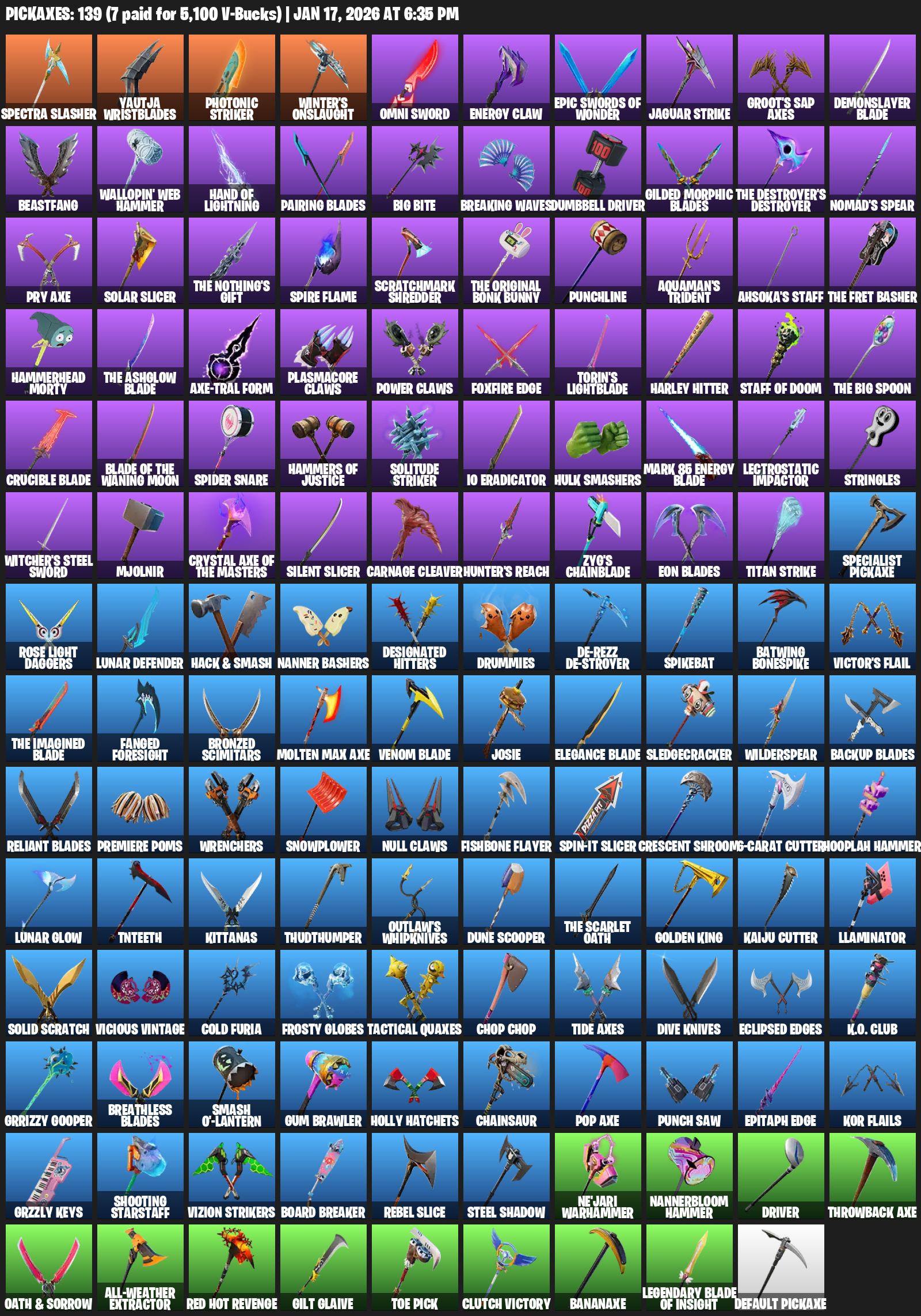Yautja Wristblades, Photonic Striker, Winter’s Onslaught, Omni Sword, Energy Claw, Jaguar Strike, Groot’s Sap Axes, Demonslayer Blade, Beastfang, Wallopin’ Web Hammer, Hand of Lightning, Pairing Blades, Big Bite, Breaking Waves, Dumbbell Driver, Nomad’s Spear
