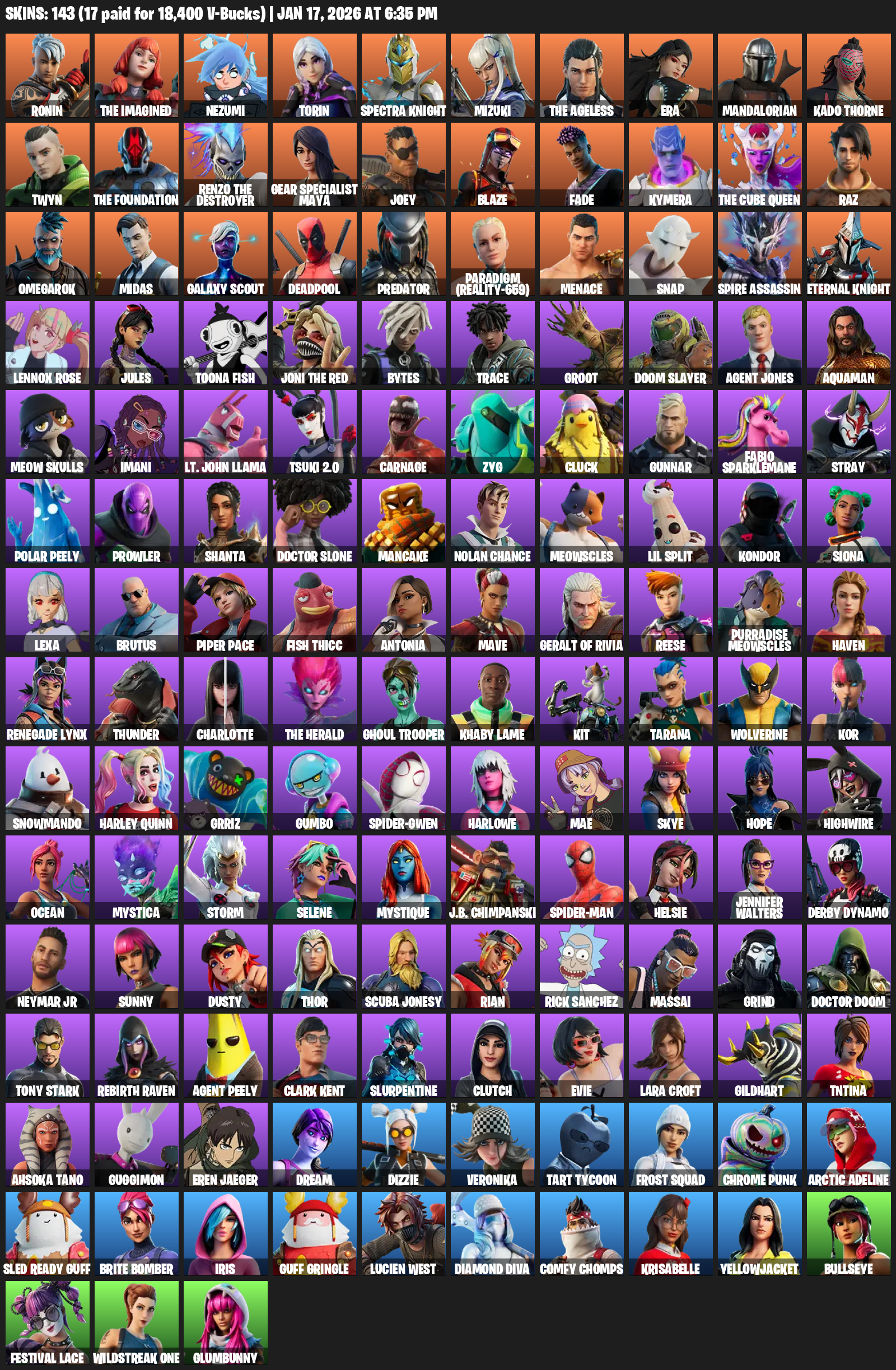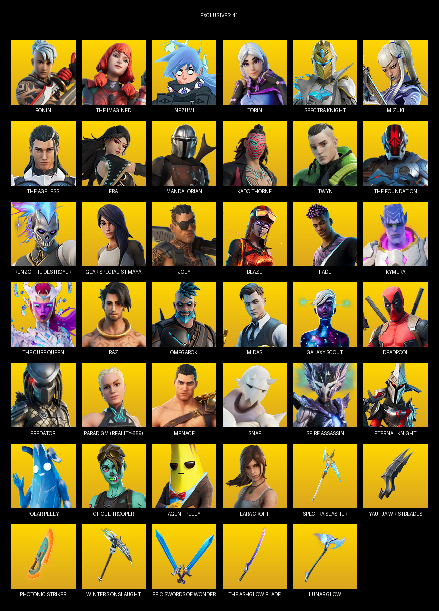 Gear Specialist Maya, Lara Croft, Ronin, The Imagined, Nezumi, Torin, Spectra Knight, Mizuki, Era, Mandalorian, Kado Thorne, Twyn, Joey, Blaze, Fade, Kymera