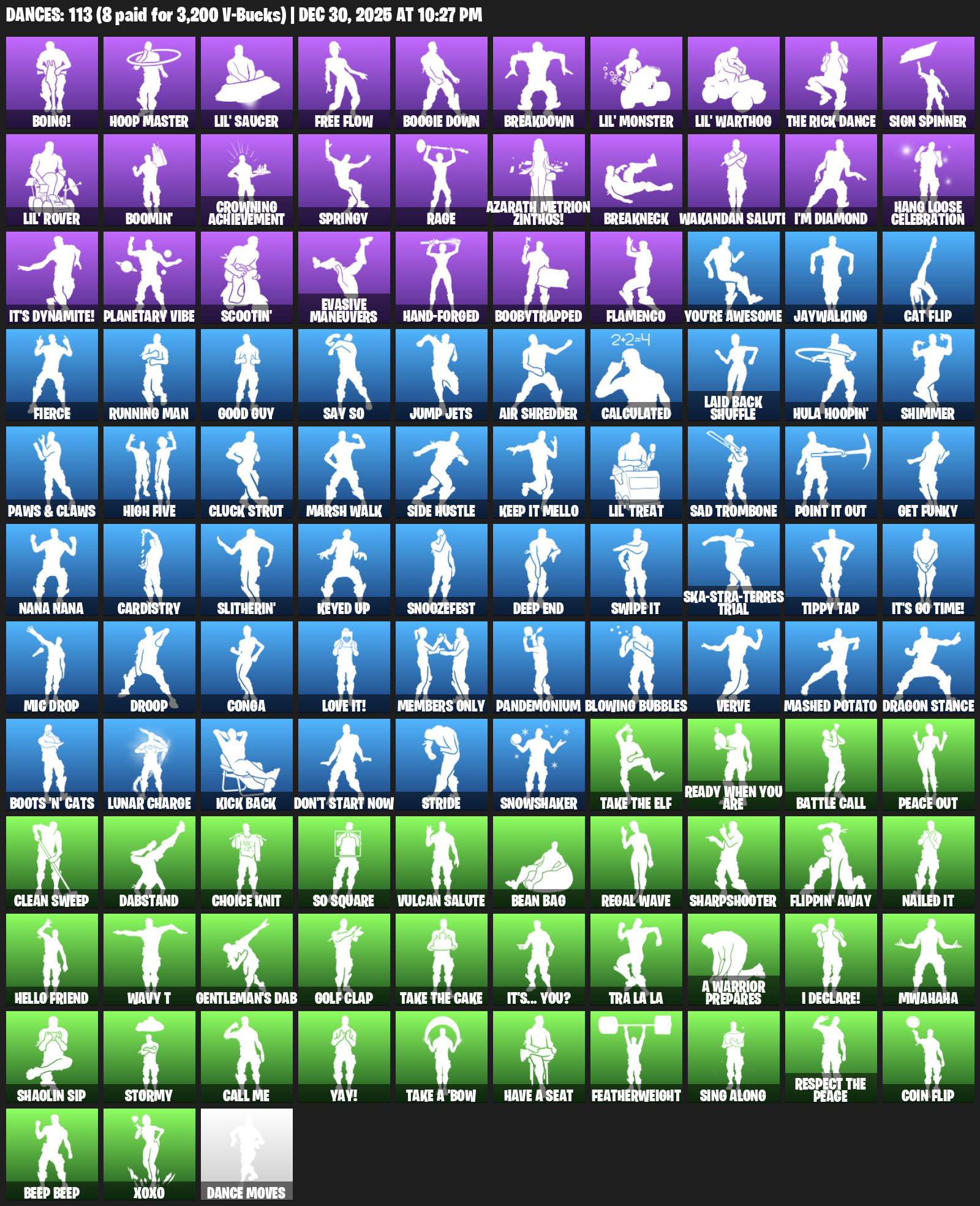Boing!, Hoop Master, Lil’ Saucer, Free Flow, Boogie Down, Breakdown, Sign Spinner, Boomin’, Crowning Achievement, Springy, Rage, Azarath Metrion Zinthos!, Breakneck, Wakandan Salute, I’m Diamond, Hang Loose Celebration