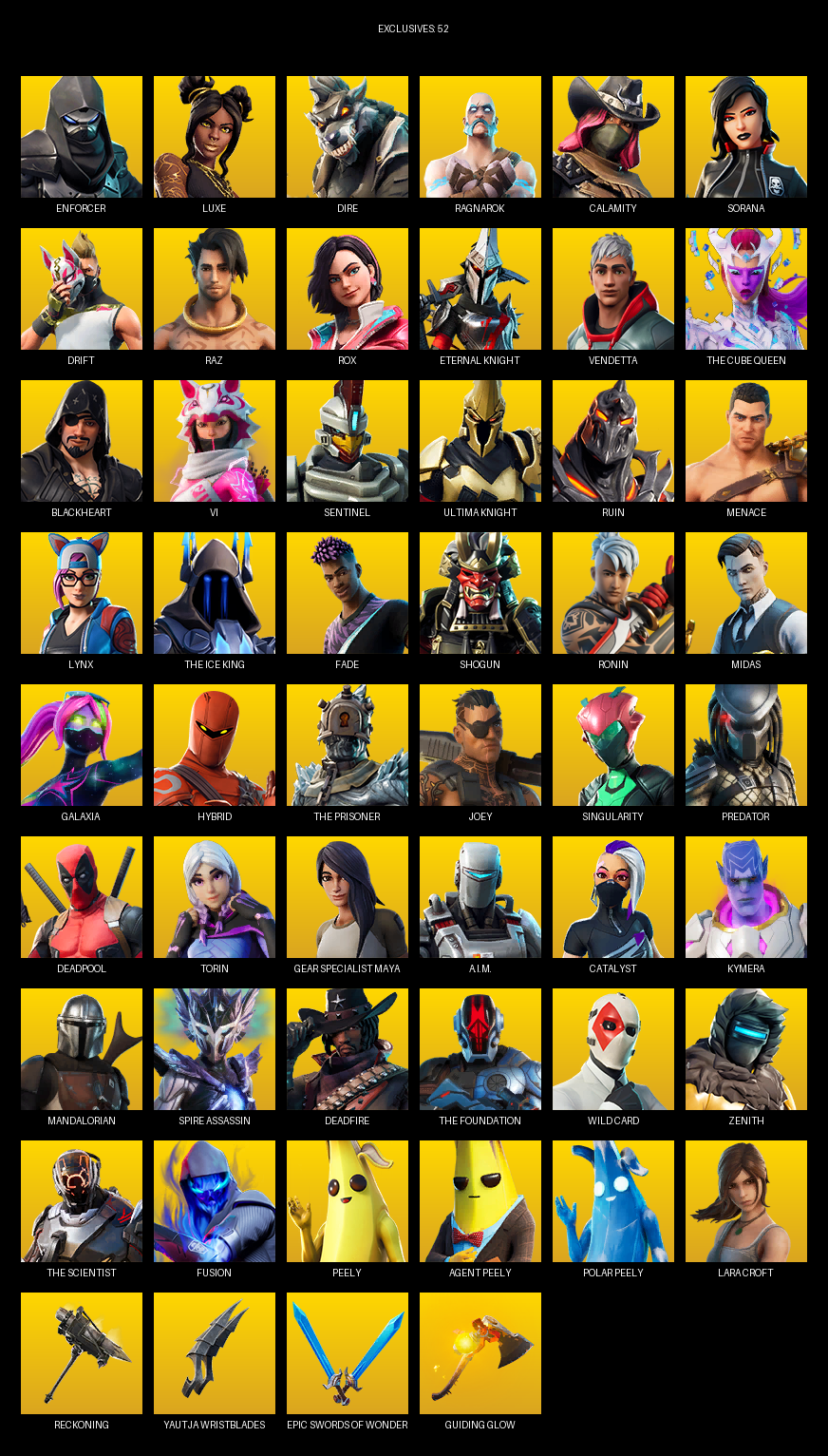 Reckoning, Yautja Wristblades, Gravity Hammer, Mjolnir, Marshmallets, Solitude Striker, Pry Axe, Hand of Lightning, Cosmic Llamacorn, Eon Blades, Vanquisher, Rift Edge, Groot’s Sap Axes, Flawless, Stringles, Beastfang, Solar Slicer