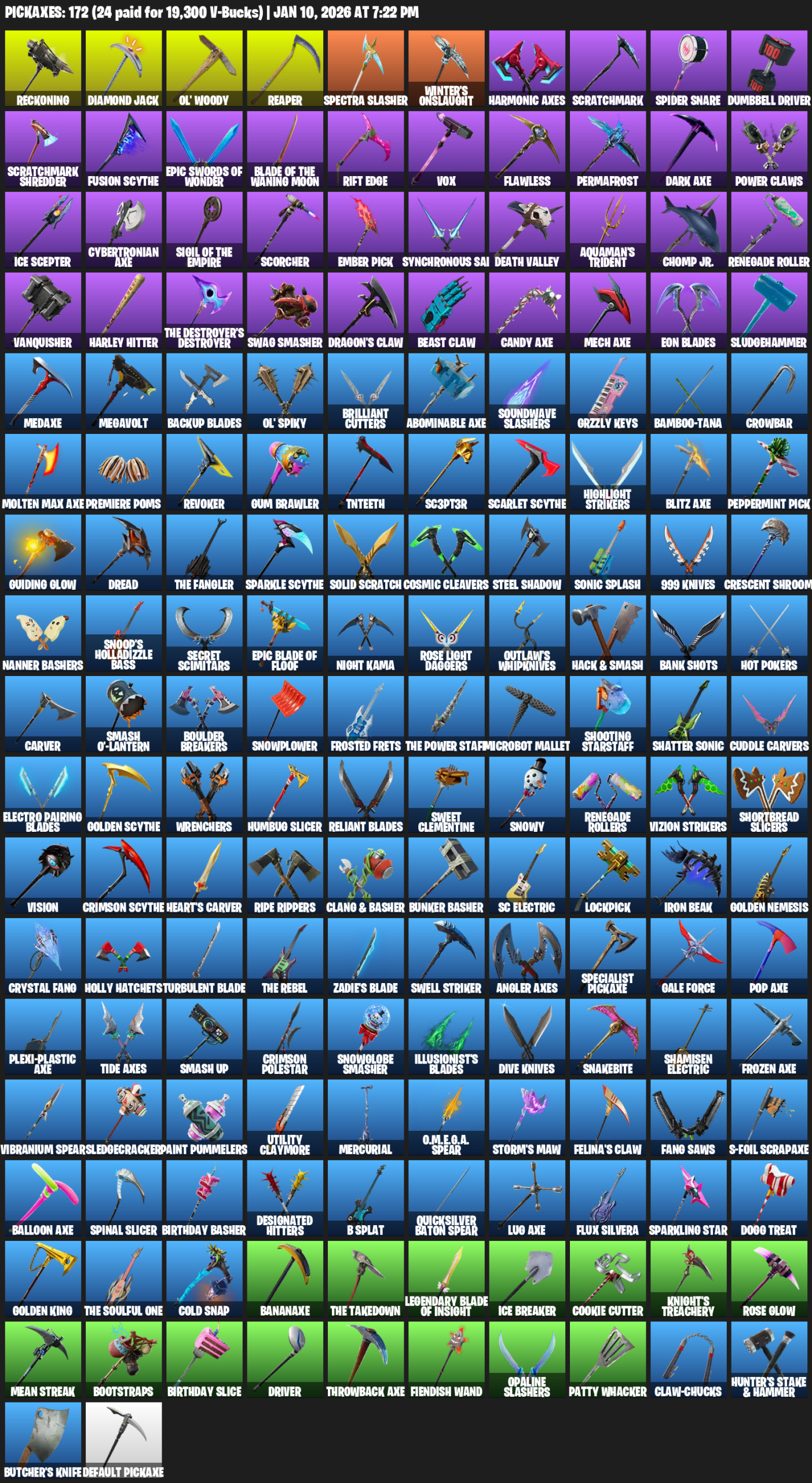 Reckoning, Diamond Jack, Ol’ Woody, Reaper, Spectra Slasher, Winter’s Onslaught, Harmonic Axes, Scratchmark, Spider Snare, Dumbbell Driver, Fusion Scythe, Rift Edge, Vox, Flawless, Permafrost, Dark Axe, Power Claws