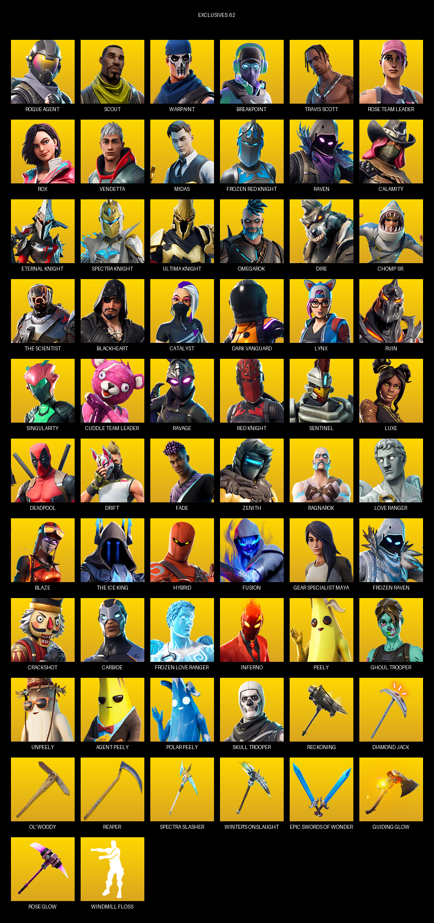 Travis Scott, Gear Specialist Maya, Rogue Agent, Scout, Warpaint, Breakpoint, Rose Team Leader, Rox, Vendetta, Midas, Frozen Red Knight, Raven, Calamity, Omegarok, Dire, Chomp Sr., The Scientist