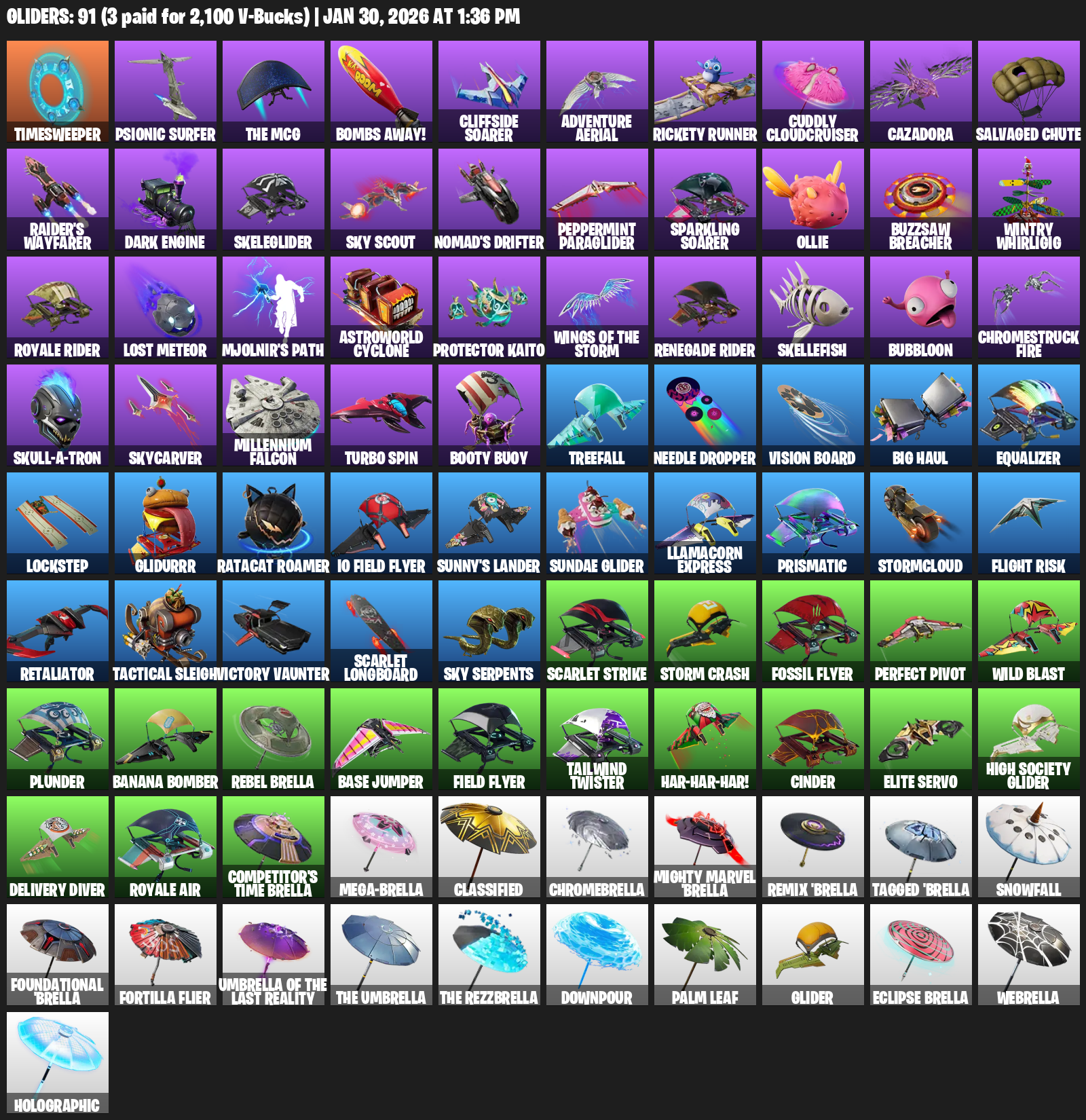 Timesweeper, Psionic Surfer, Bombs Away!, Cliffside Soarer, Adventure Aerial, Rickety Runner, Cuddly Cloudcruiser, Cazadora, Salvaged Chute, Raider’s Wayfarer, Skeleglider, Sky Scout, Peppermint Paraglider, Ollie, Buzzsaw Breacher, Wintry Whirligig