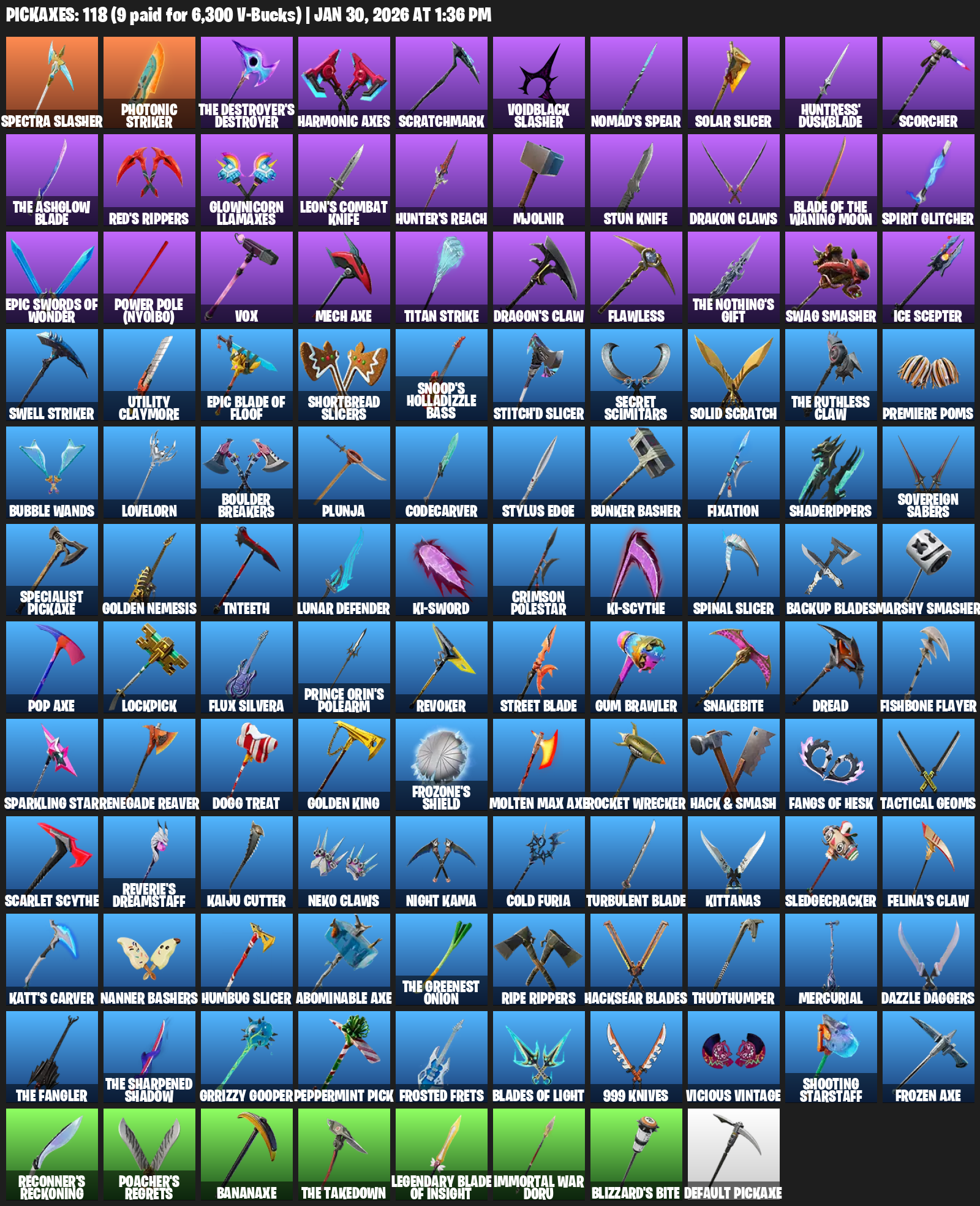 Photonic Striker, Harmonic Axes, Scratchmark, Voidblack Slasher, Nomad’s Spear, Solar Slicer, Huntress’ Duskblade, Scorcher, Red’s Rippers, Glownicorn Llamaxes, Leon’s Combat Knife, Hunter’s Reach, Mjolnir, Drakon Claws, Spirit Glitcher