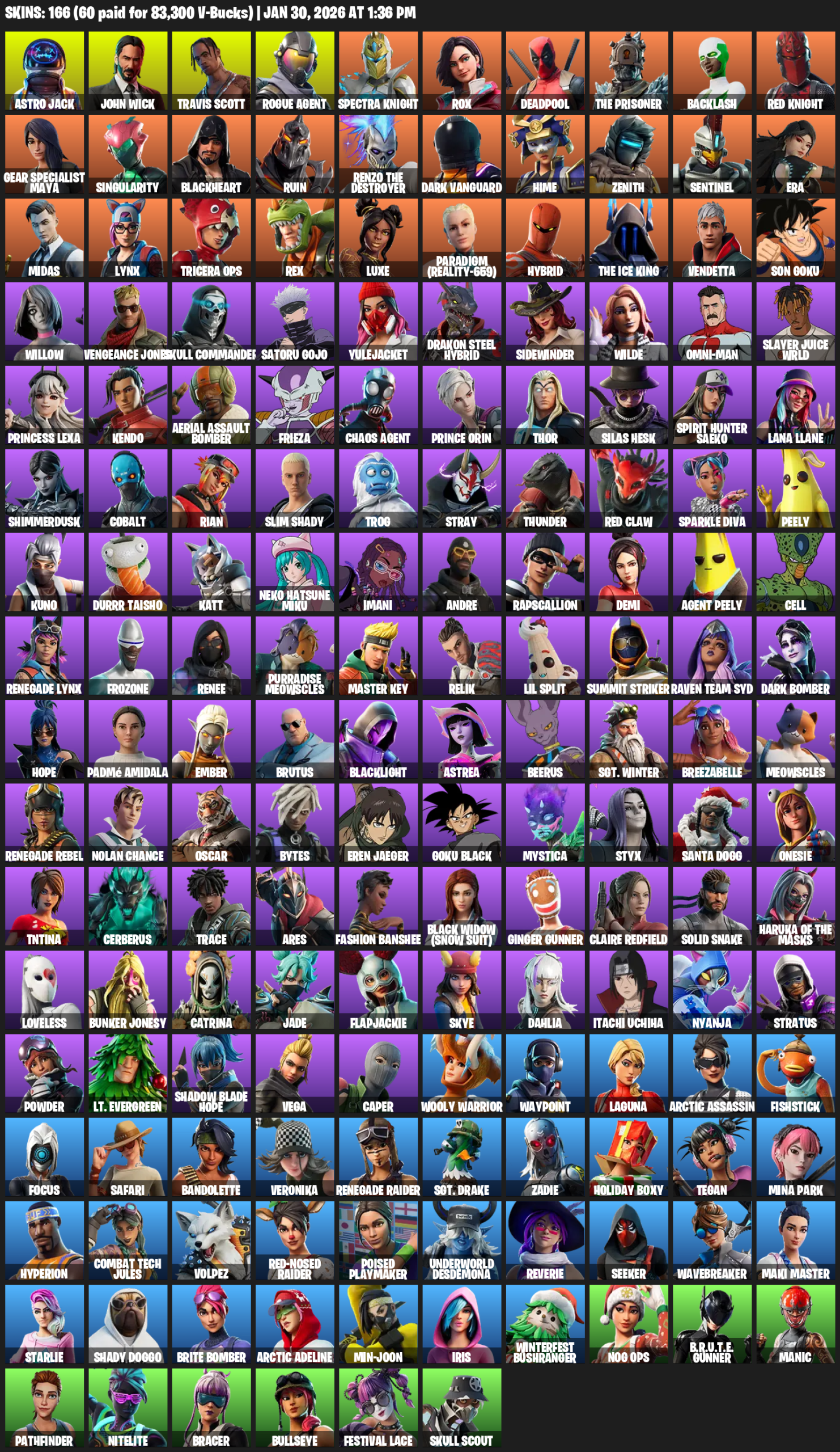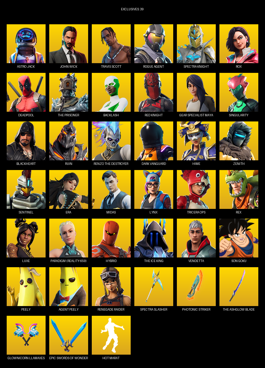 Travis Scott, Gear Specialist Maya, Renegade Raider, Astro Jack, John Wick, Rogue Agent, Spectra Knight, Rox, Deadpool, The Prisoner, Backlash, Singularity, Blackheart, Ruin, Dark Vanguard, Hime, Zenith, Sentinel