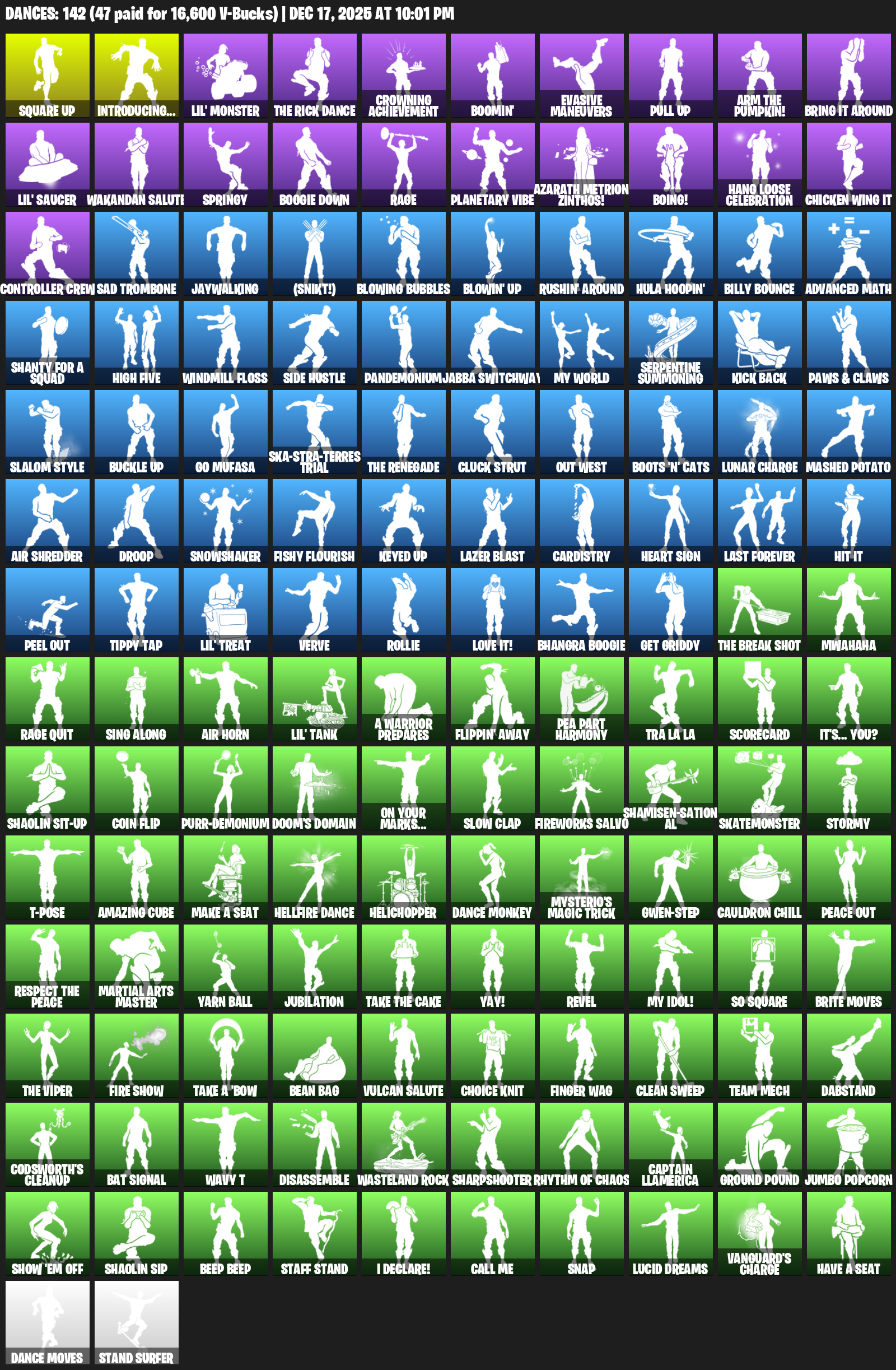 Introducing…, Square Up, Lil’ Monster, The Rick Dance, Crowning Achievement, Boomin’, Evasive Maneuvers, Bring it around, Wakandan Salute, Springy, Boogie Down, Rage, Planetary Vibe, Azarath Metrion Zinthos!, Boing!, Hang Loose Celebration