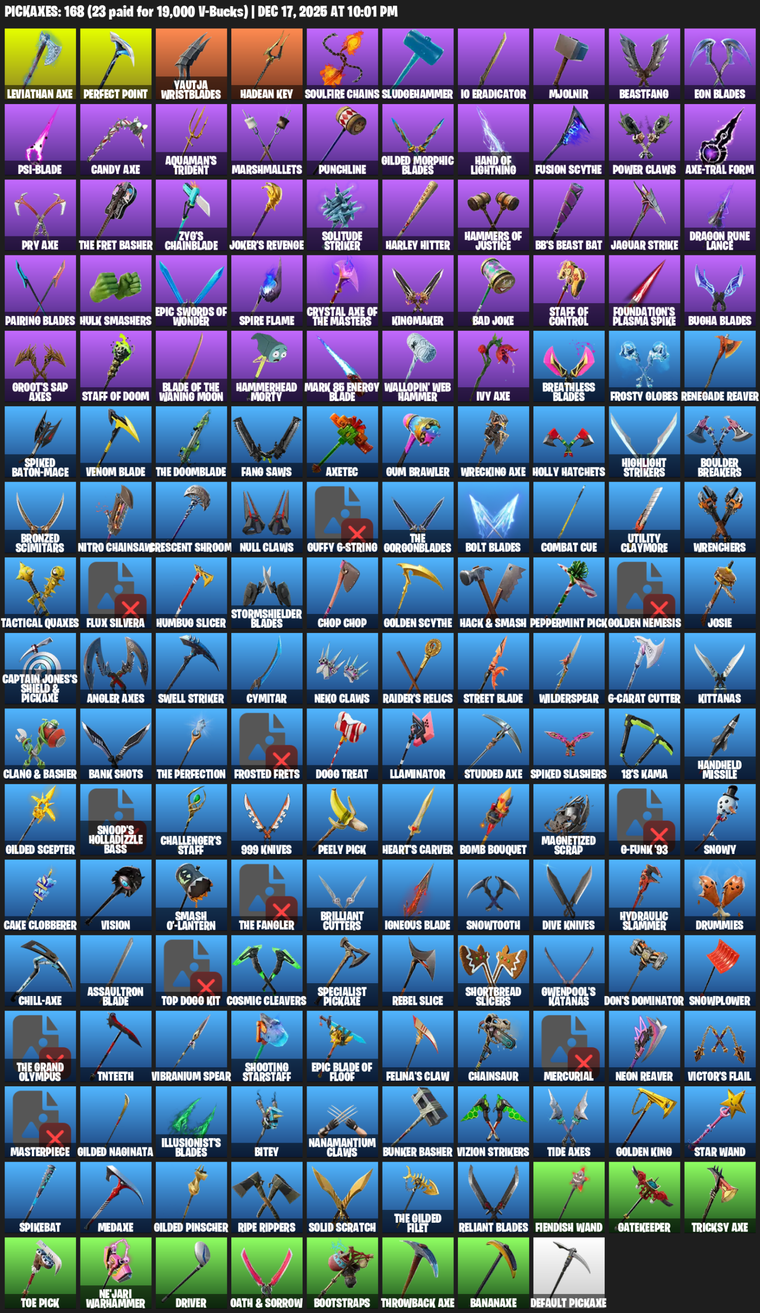 Leviathan Axe, Perfect Point, Yautja Wristblades, Hadean Key, Soulfire Chains, Sludgehammer, IO Eradicator, Mjolnir, Beastfang, Eon Blades, Psi-blade, Aquaman’s Trident, Marshmallets, Punchline, Hand of Lightning, Fusion Scythe, Power Claws