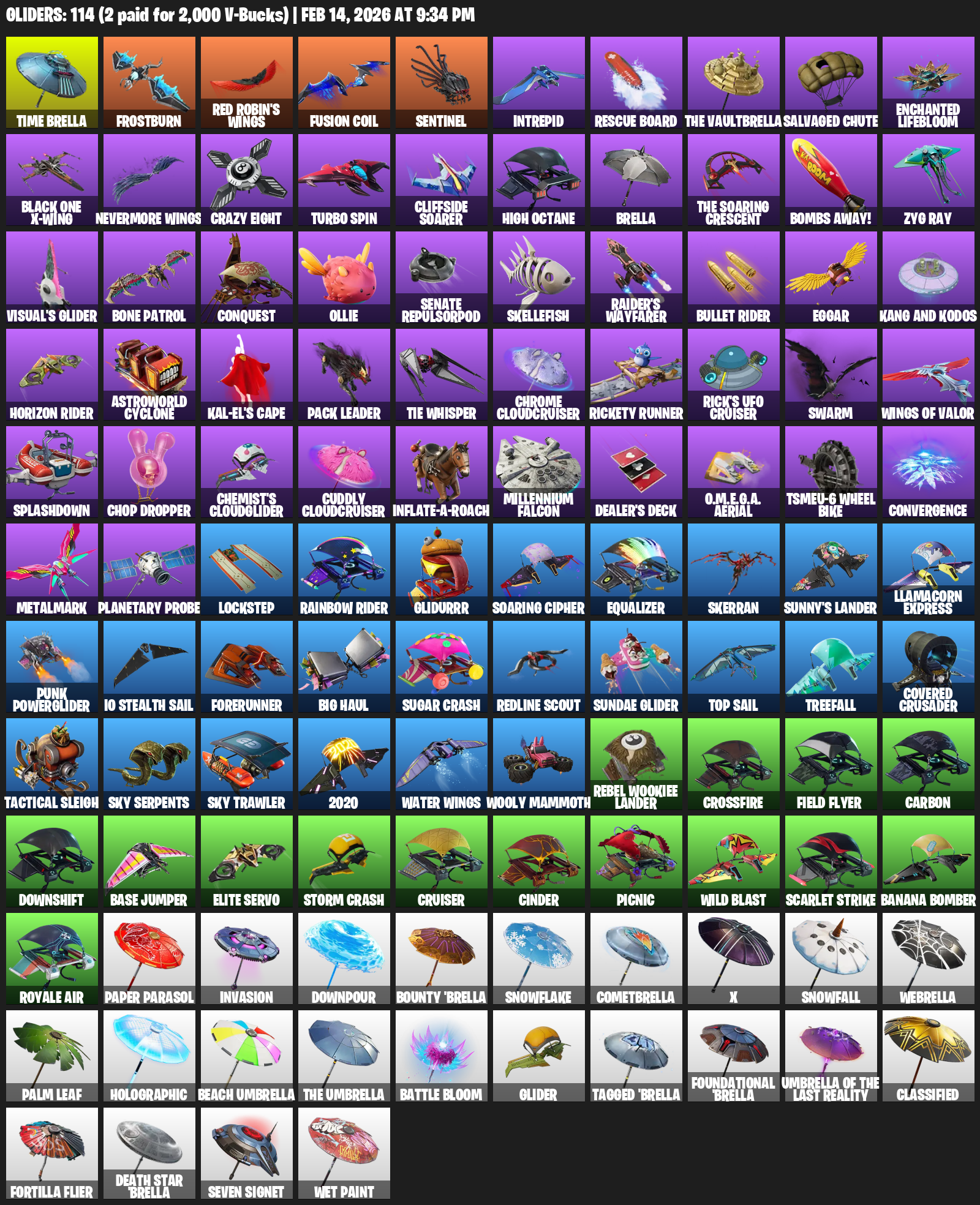 Time Brella, Frostburn, Fusion Coil, Intrepid, Rescue Board, Salvaged Chute, Enchanted Lifebloom, Black One X-wing, Nevermore Wings, Crazy Eight, Turbo Spin, Cliffside Soarer, High Octane, Bombs Away!, Zyg Ray
