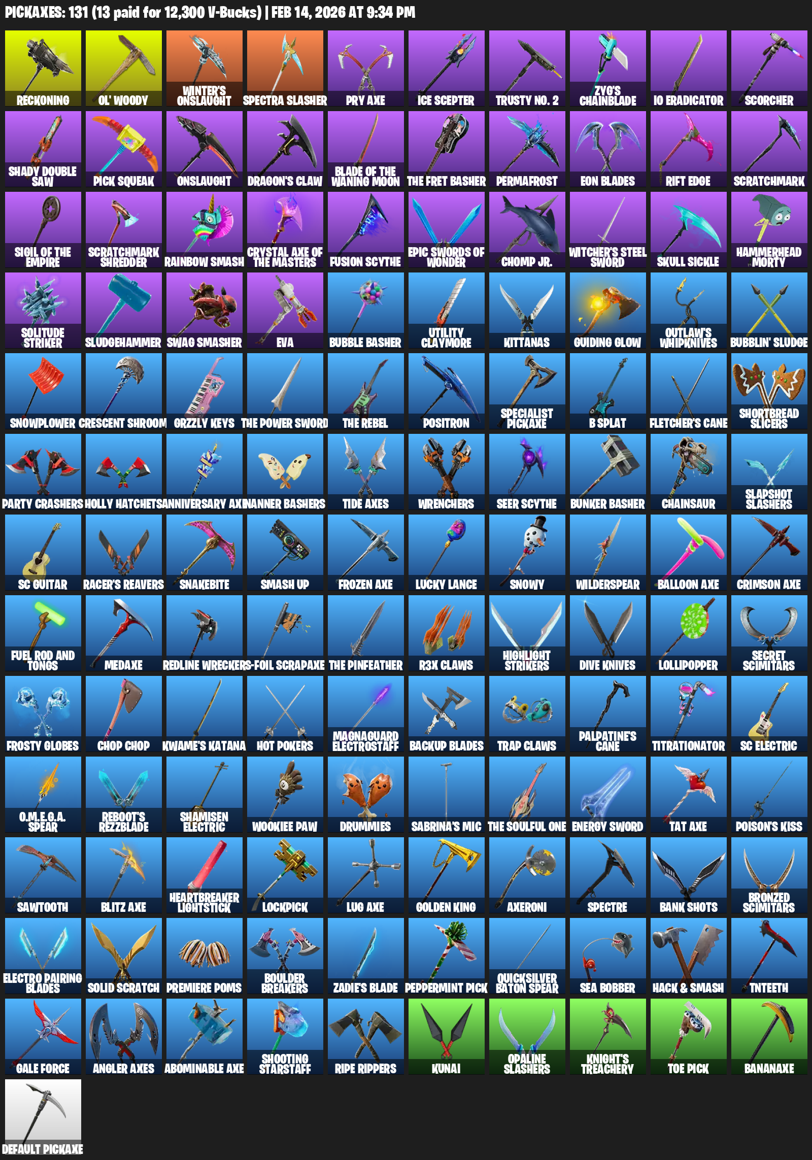 Reckoning, Ol’ Woody, Winter’s Onslaught, Spectra Slasher, Pry Axe, Ice Scepter, Trusty No. 2, Zyg’s Chainblade, IO Eradicator, Scorcher, Shady Double Saw, Pick Squeak, Dragon’s Claw, Permafrost, Eon Blades, Rift Edge, Scratchmark