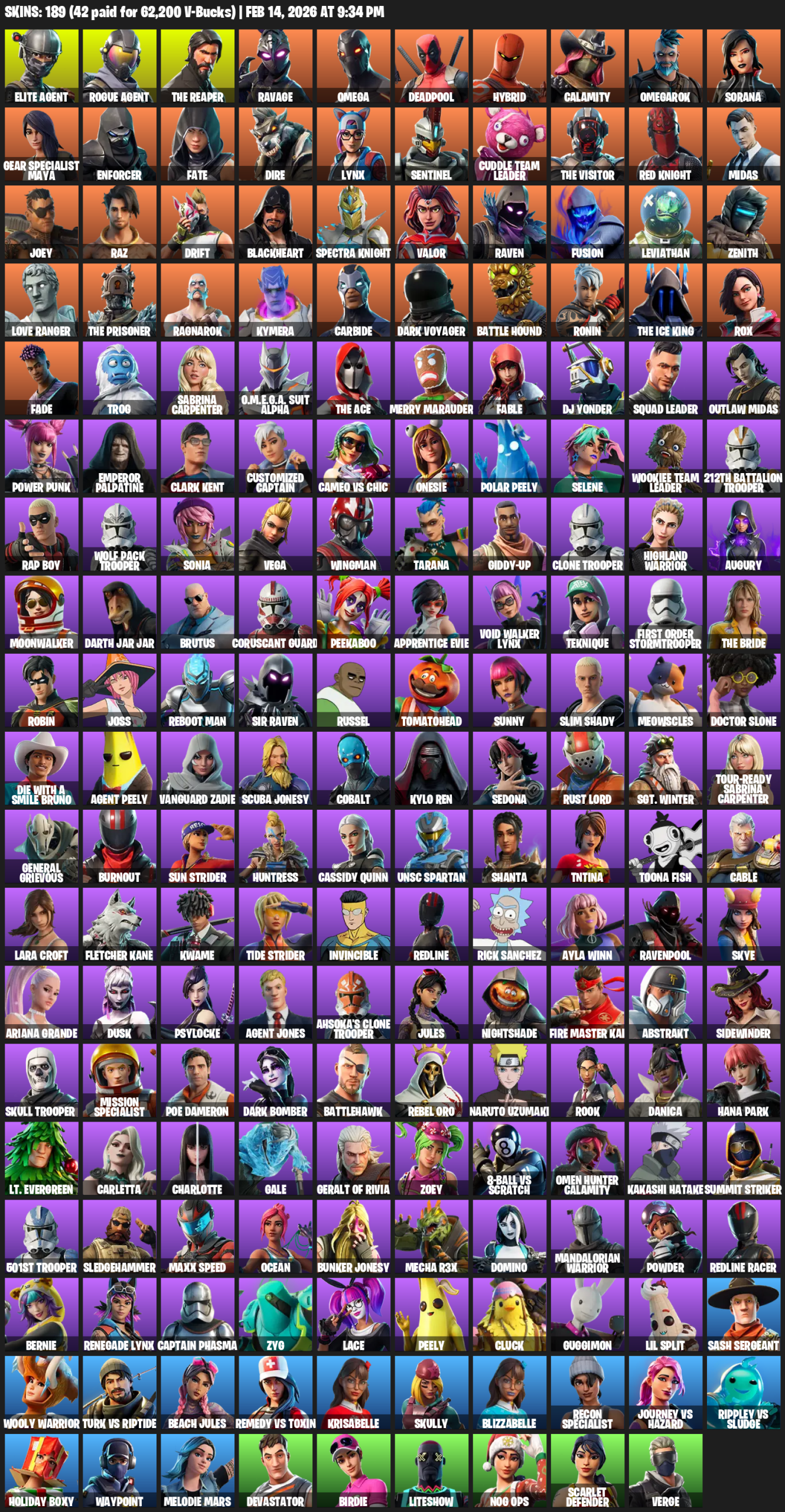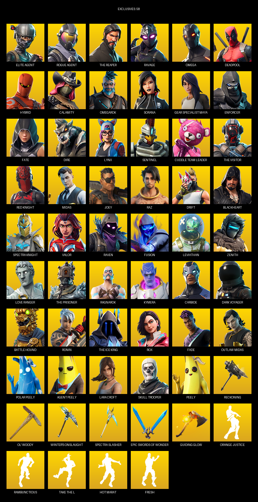 Elite Agent, The Reaper, Omega, Gear Specialist Maya, Lara Croft, Ravage, Deadpool, Hybrid, Calamity, Omegarok, Sorana, Enforcer, Fate, Dire, Lynx, Sentinel, Cuddle Team Leader, Red Knight