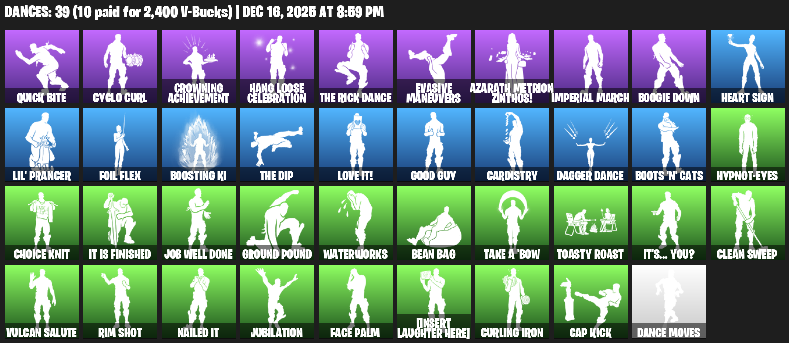 Quick Bite, Cyclo Curl, Crowning Achievement, Hang Loose Celebration, Evasive Maneuvers, Azarath Metrion Zinthos!, Imperial March, Boogie Down, Heart Sign, Lil’ Prancer, Foil Flex, Boosting Ki, Love it!, Good Guy, Cardistry, Dagger Dance, Boots ‘n’ Cats, Hypnot-Eyes