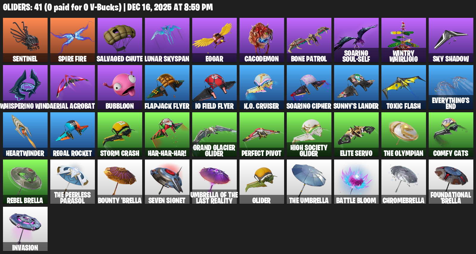 Sentinel, Salvaged Chute, Lunar Skyspan, Eggar, Cacodemon, Bone Patrol, Soaring Soul-Self, Wintry Whirligig, Sky Shadow, Whispering Wind, Aerial Acrobat, Bubbloon, Flapjack Flyer, K.O. Cruiser, Sunny’s Lander, Toxic Flash, Everything’s End