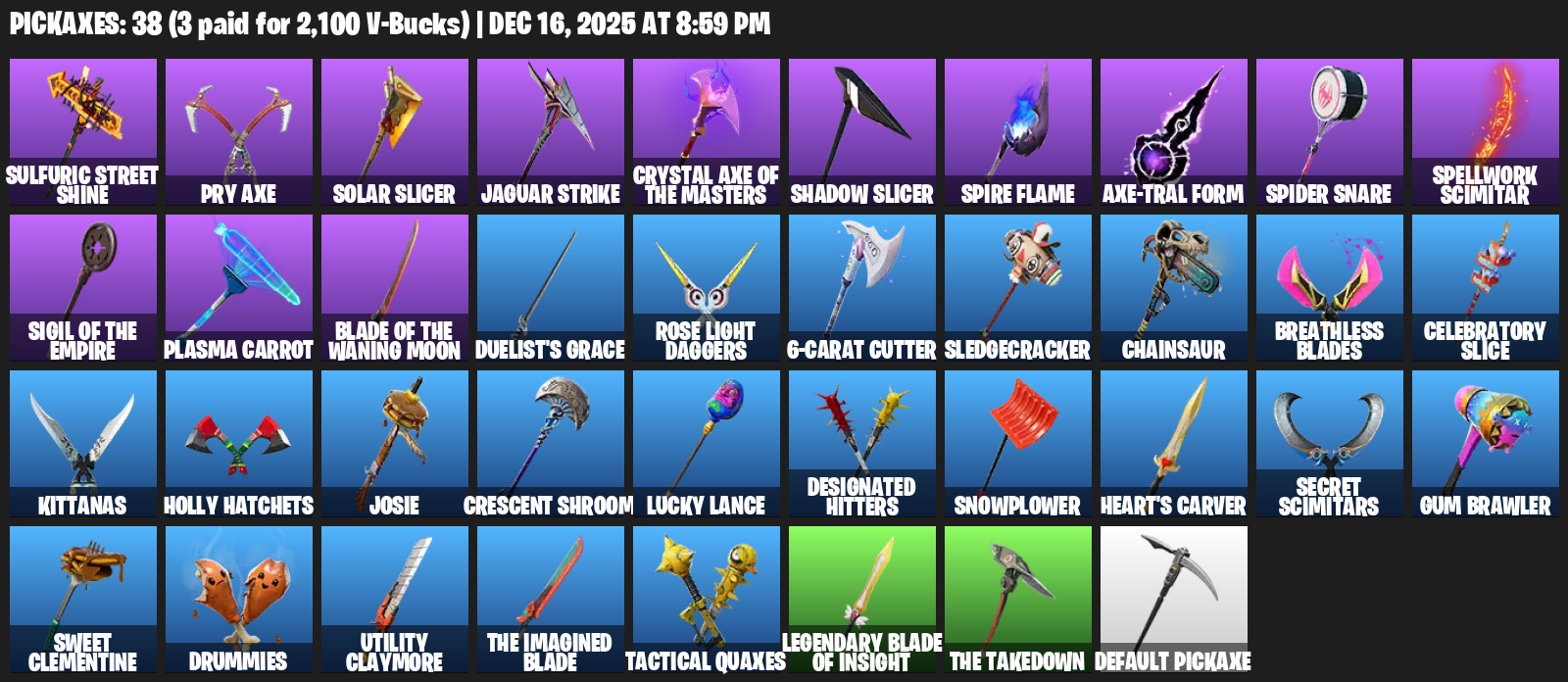 Sulfuric Street Shine, Pry Axe, Solar Slicer, Jaguar Strike, Spider Snare, Spellwork Scimitar, Sigil of the Empire, Plasma Carrot, Duelist’s Grace, Rose Light Daggers, 6-Carat Cutter, Sledgecracker, Chainsaur, Breathless Blades, Celebratory Slice