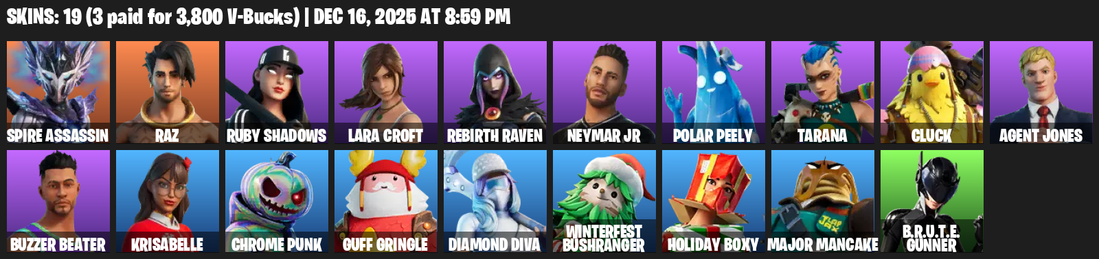 Lara Croft, Spire Assassin, Raz, Ruby Shadows, Rebirth Raven, Neymar Jr, Polar Peely, Tarana, Cluck, Agent Jones, Buzzer Beater, Krisabelle, Chrome Punk, Guff Gringle, Diamond Diva, Winterfest Bushranger, Holiday Boxy, Major Mancake, B.R.U.T.E. Gunner