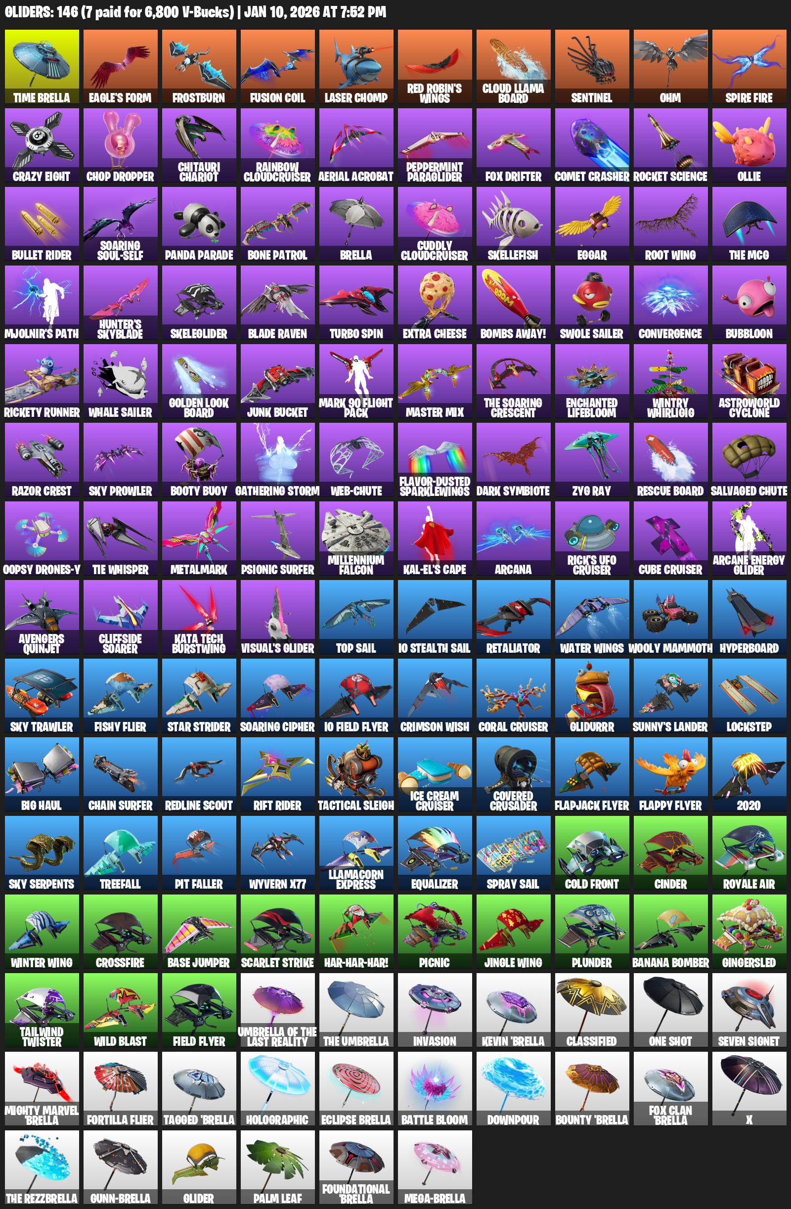 Time Brella, Eagle’s Form, Frostburn, Fusion Coil, Laser Chomp, Red Robin’s Wings, Cloud Llama Board, Sentinel, Ohm, Spire Fire, Crazy Eight, Chop Dropper, Chitauri Chariot, Rainbow Cloudcruiser, Aerial Acrobat, Peppermint Paraglider, Fox Drifter, Comet Crasher, Rocket Science, Ollie