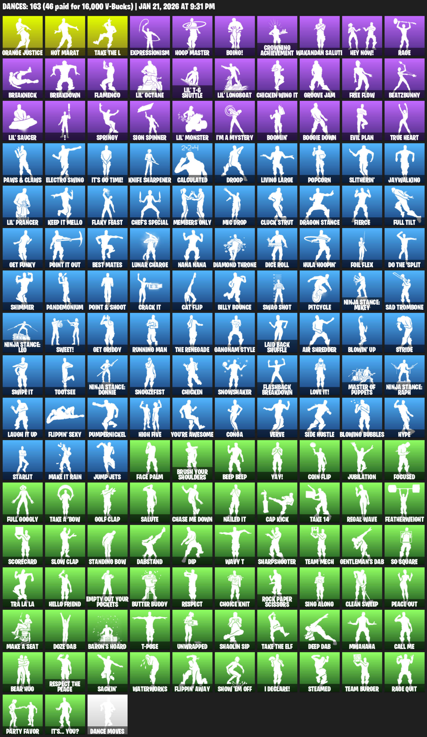 Hot Marat, Orange Justice, Expressionism, Boing!, Crowning Achievement, Wakandan Salute, Hey Now!, Rage, Breakneck, Breakdown, Flamenco, Lil’ Octane, Chicken Wing It, Groove Jam, Free Flow, BeatzBunny