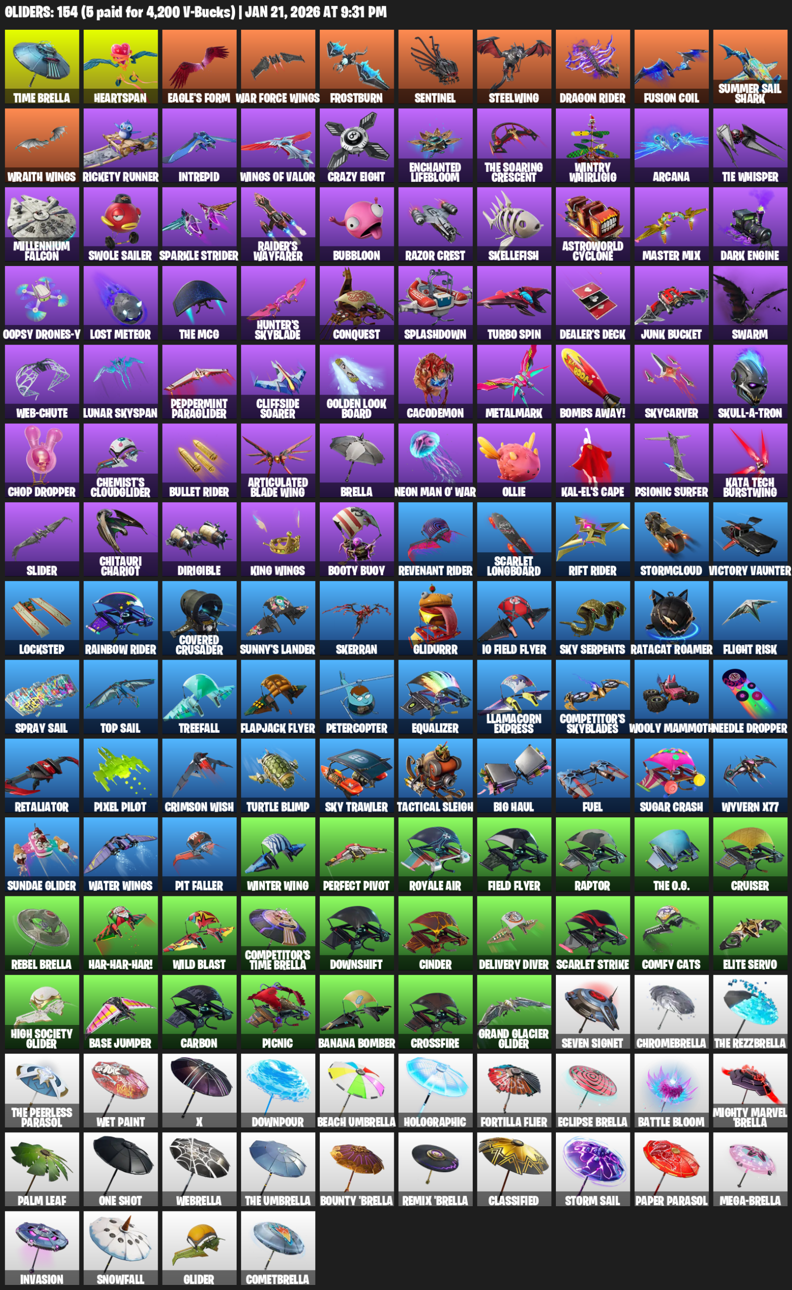 Time Brella, Heartspan, Eagle’s Form, War Force Wings, Frostburn, Sentinel, Steelwing, Summer Sail Shark, Rickety Runner, Intrepid, Crazy Eight, Enchanted Lifebloom, Wintry Whirligig, Arcana, TIE Whisper