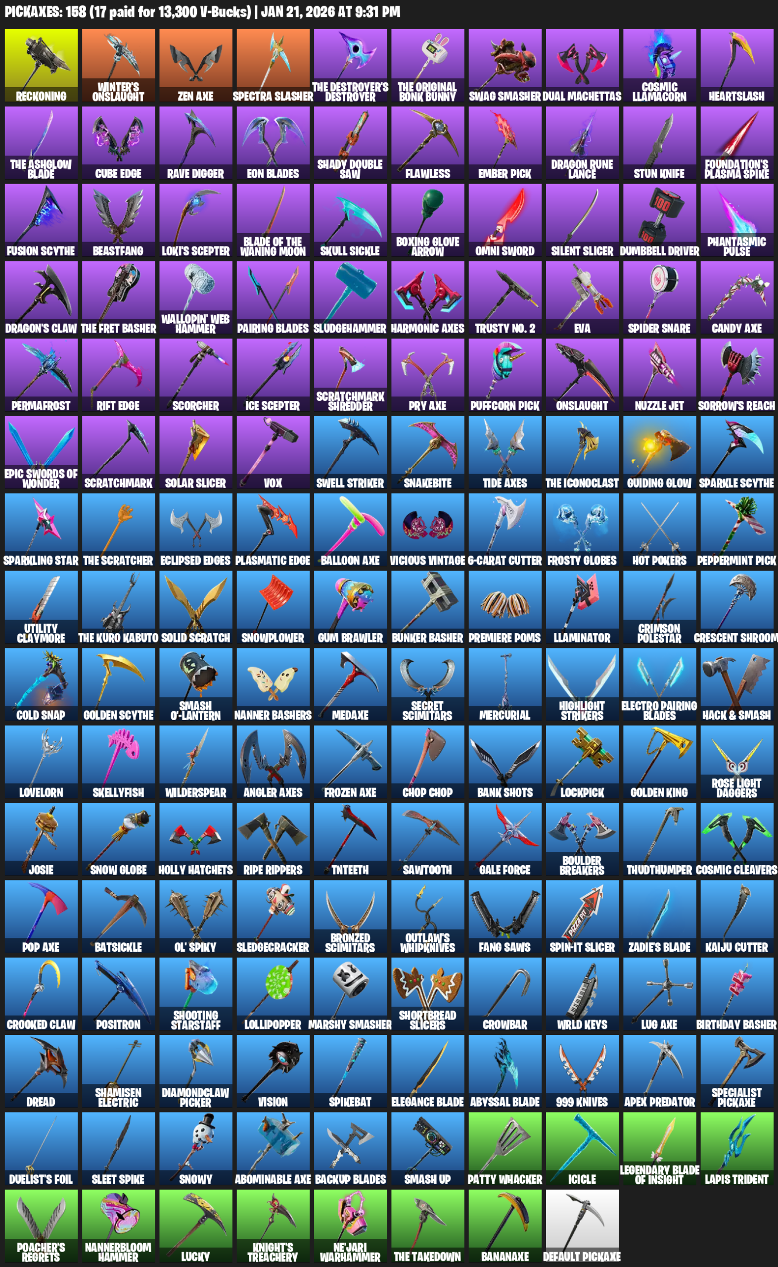 Reckoning, Winter’s Onslaught, Zen Axe, Swag Smasher, Dual Machettas, Cosmic Llamacorn, Heartslash, Cube Edge, Rave Digger, Eon Blades, Shady Double Saw, Flawless, Ember Pick, Dragon Rune Lance, Stun Knife, Foundation’s Plasma Spike