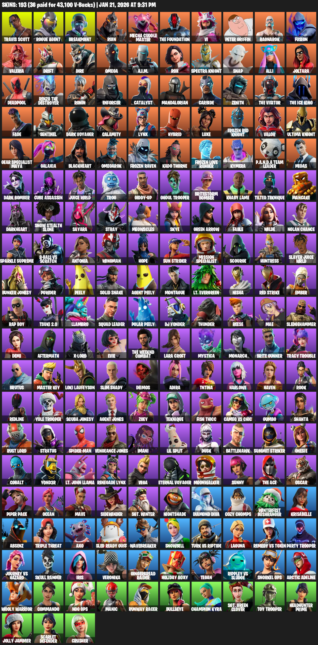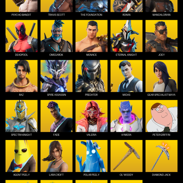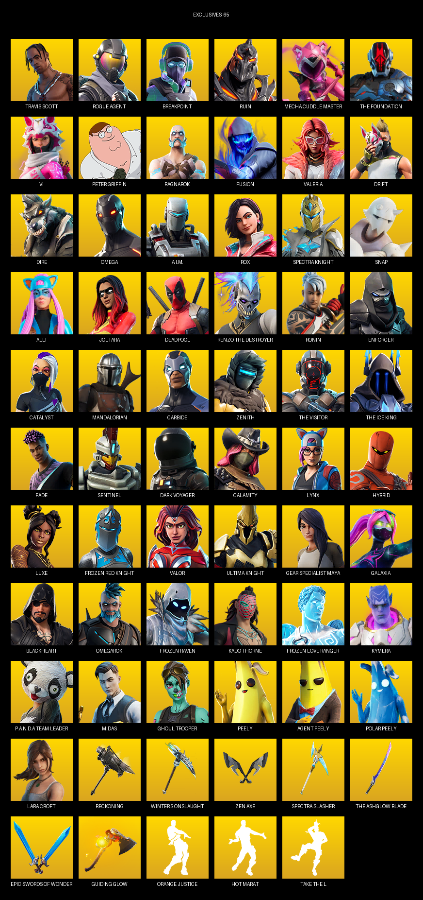 Travis Scott, Omega, Gear Specialist Maya, Lara Croft, Rogue Agent, Breakpoint, Ruin, Mecha Cuddle Master, The Foundation, Vi, Peter Griffin, Ragnarok, Fusion, Valeria, Drift, Dire, A.I.M., Rox, Spectra Knight, Snap