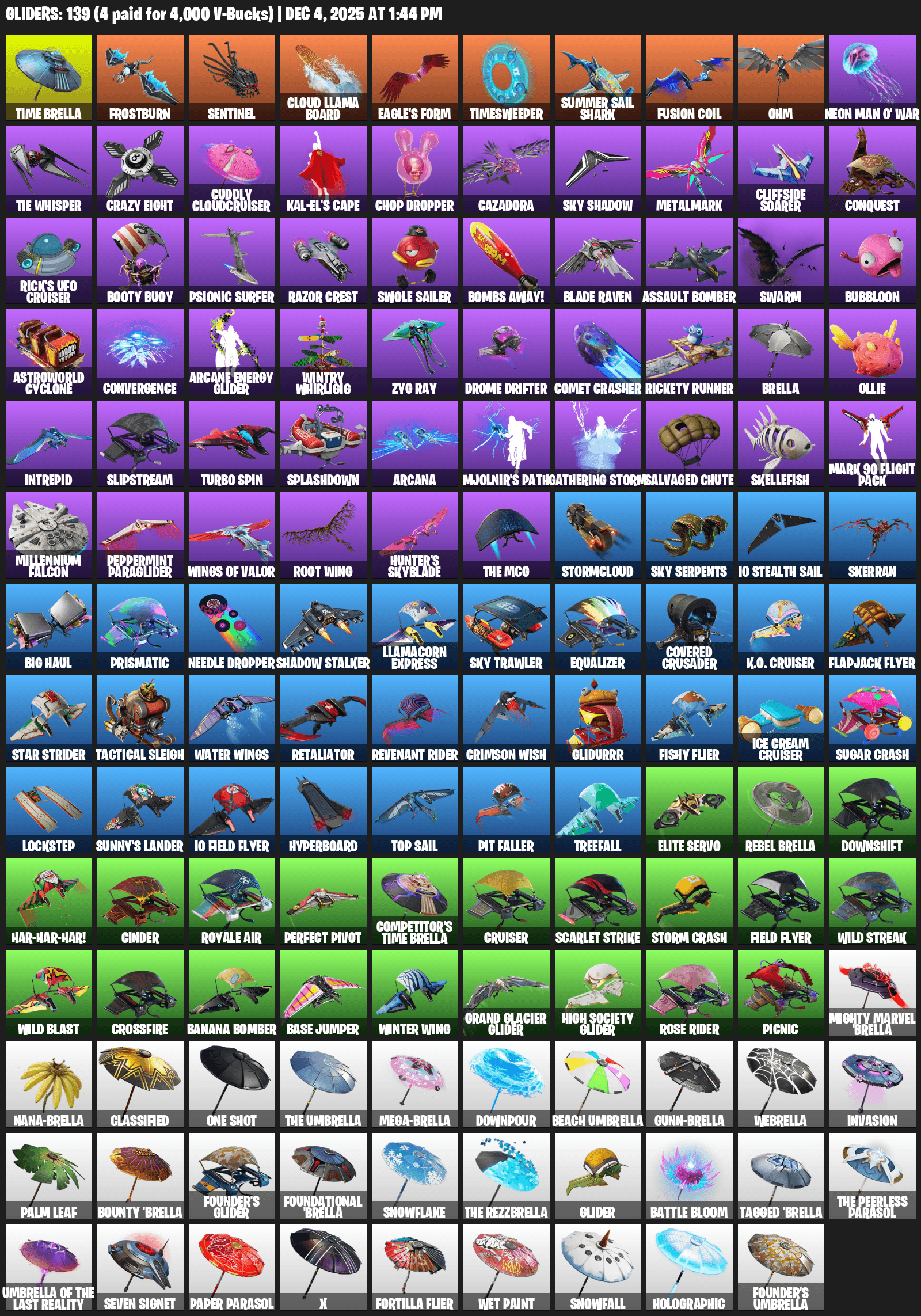 Time Brella, Frostburn, Cloud Llama Board, Eagle’s Form, Timesweeper, Summer Sail Shark, Fusion Coil, Ohm, Neon Man O’ War, TIE Whisper, Crazy Eight, Cuddly Cloudcruiser, Kal-El’s Cape, Chop Dropper, Cazadora, Metalmark, Cliffside Soarer, Conquest