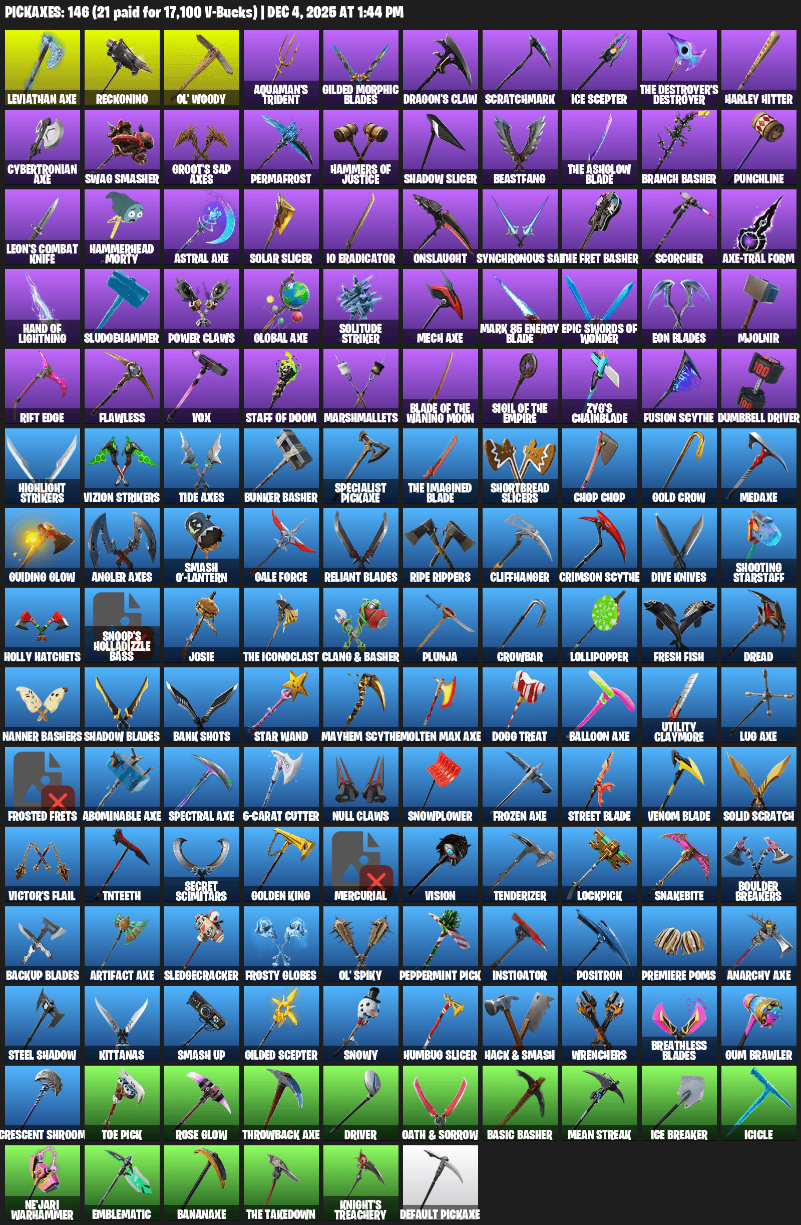 Leviathan Axe, Reckoning, Ol’ Woody, Aquaman’s Trident, Gilded Morphic Blades, Dragon’s Claw, Scratchmark, Ice Scepter, The Destroyer’s Destroyer, Harley Hitter, Swag Smasher, Groot’s Sap Axes, Permafrost, Hammers of Justice, Shadow Slicer, Beastfang, Branch Basher, Punchline