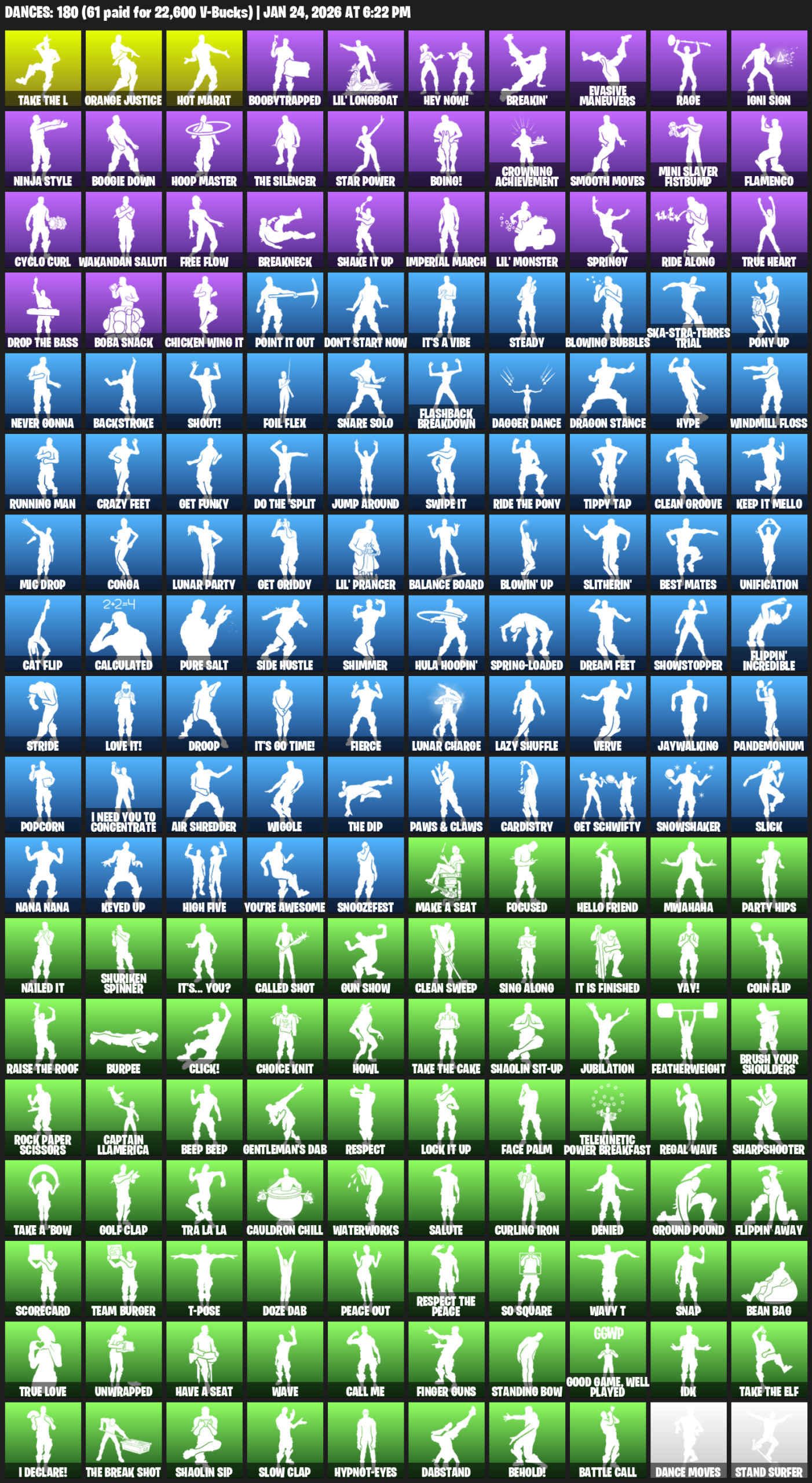 Hot Marat, Boobytrapped, Lil’ Longboat, Hey Now!, Breakin’, Evasive Maneuvers, Rage, Igni Sign, Ninja Style, Boogie Down, Hoop Master, Star Power, Boing!, Crowning Achievement, Smooth Moves, Mini Slayer Fistbump, Flamenco