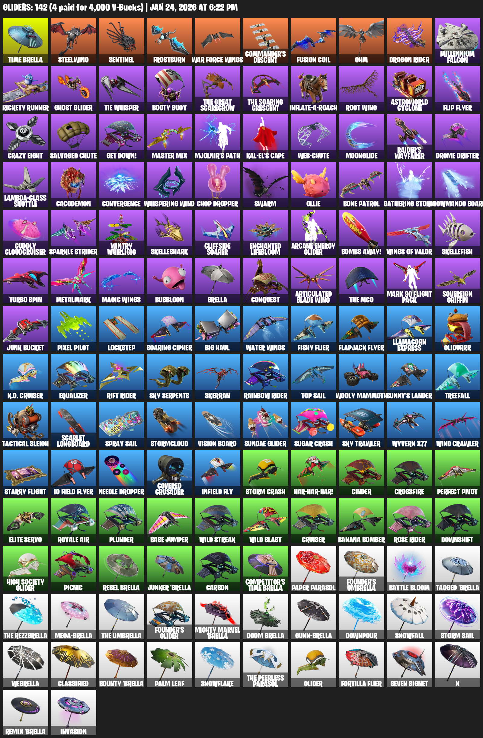 Time Brella, Steelwing, Frostburn, War Force Wings, Commander’s Descent, Ohm, Dragon Rider, Millennium Falcon, Rickety Runner, Ghost Glider, TIE Whisper, Booty Buoy, Inflate-A-Roach, Root Wing, Astroworld Cyclone, Flip Flyer