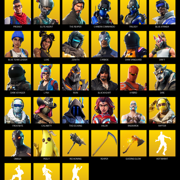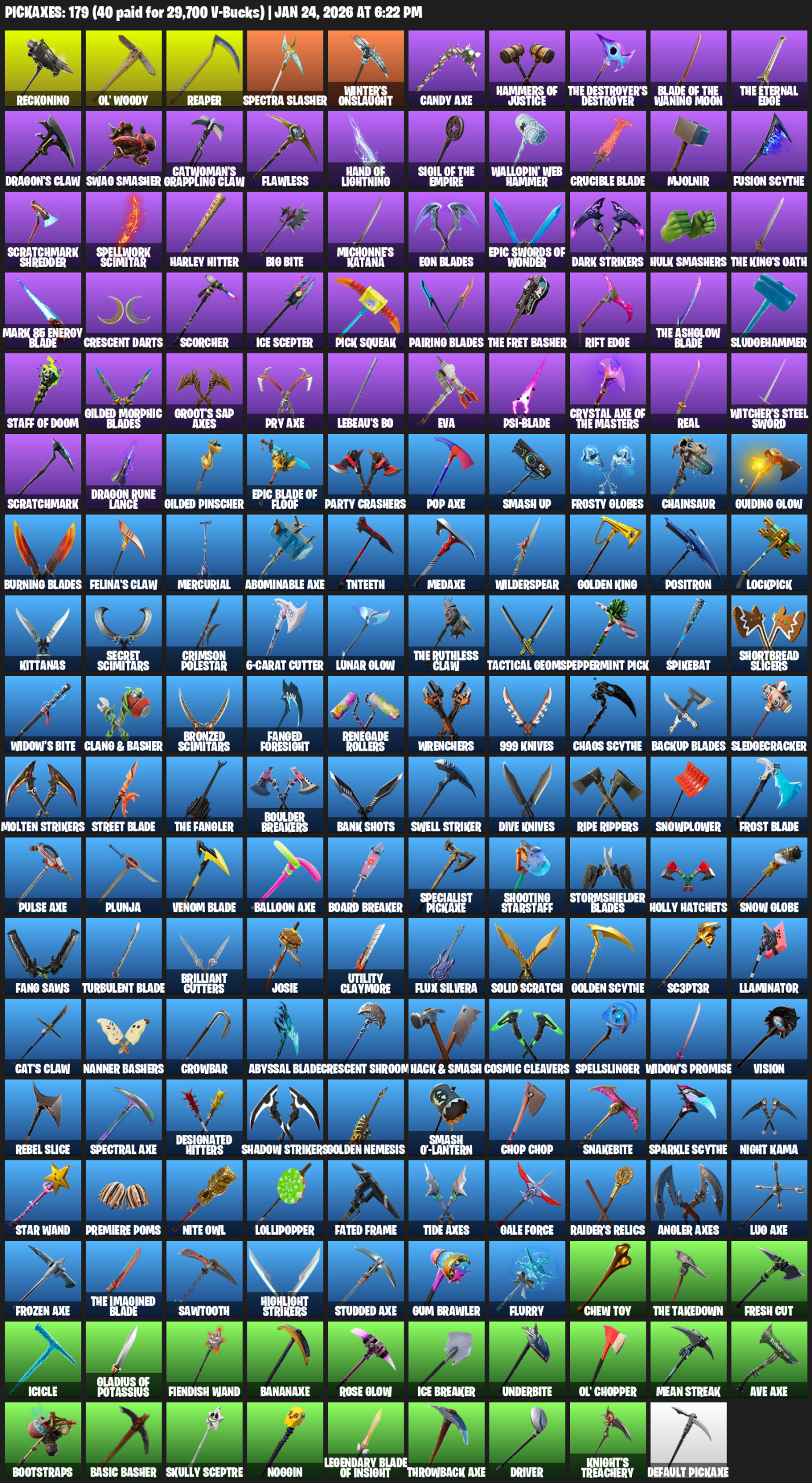 Reckoning, Ol’ Woody, Reaper, Spectra Slasher, Winter’s Onslaught, Candy Axe, Hammers of Justice, The Destroyer’s Destroyer, Dragon’s Claw, Swag Smasher, Flawless, Wallopin’ Web Hammer, Crucible Blade, Mjolnir, Fusion Scythe
