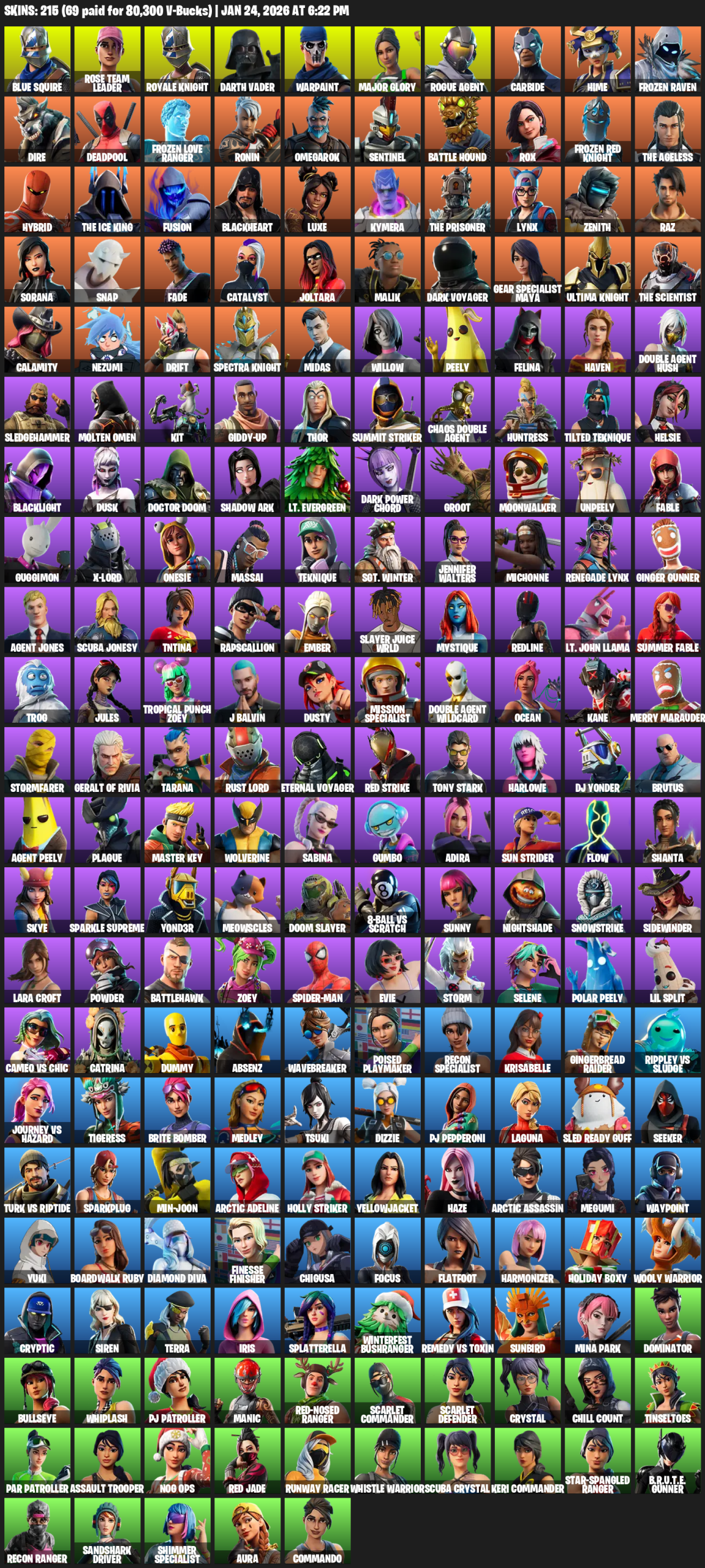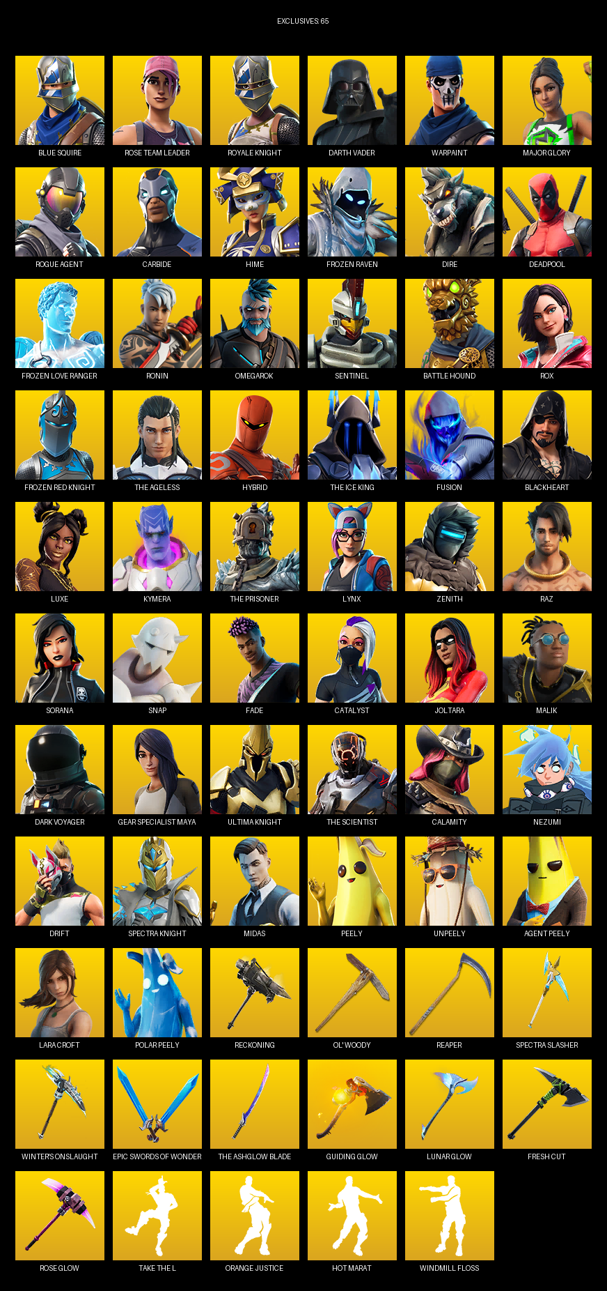 Blue Squire, Royale Knight, Gear Specialist Maya, Lara Croft, Rose Team Leader, Darth Vader, Warpaint, Major Glory, Rogue Agent, Carbide, Hime, Frozen Raven, Dire, Deadpool, Ronin, Omegarok, Sentinel, Battle Hound, Rox