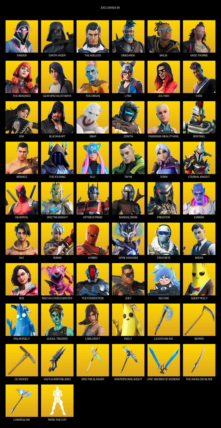 Leviathan Axe, Reaper, Ol’ Woody, Yautja Wristblades, Spectra Slasher, Winter’s Onslaught, Beastfang, Witcher’s Steel Sword, Spider Snare, Vox, Power Claws, Sorrow’s Reach, Swag Smasher, Punchline, Lucha Slashers, Scratchmark Shredder, Dragon Rune Lance