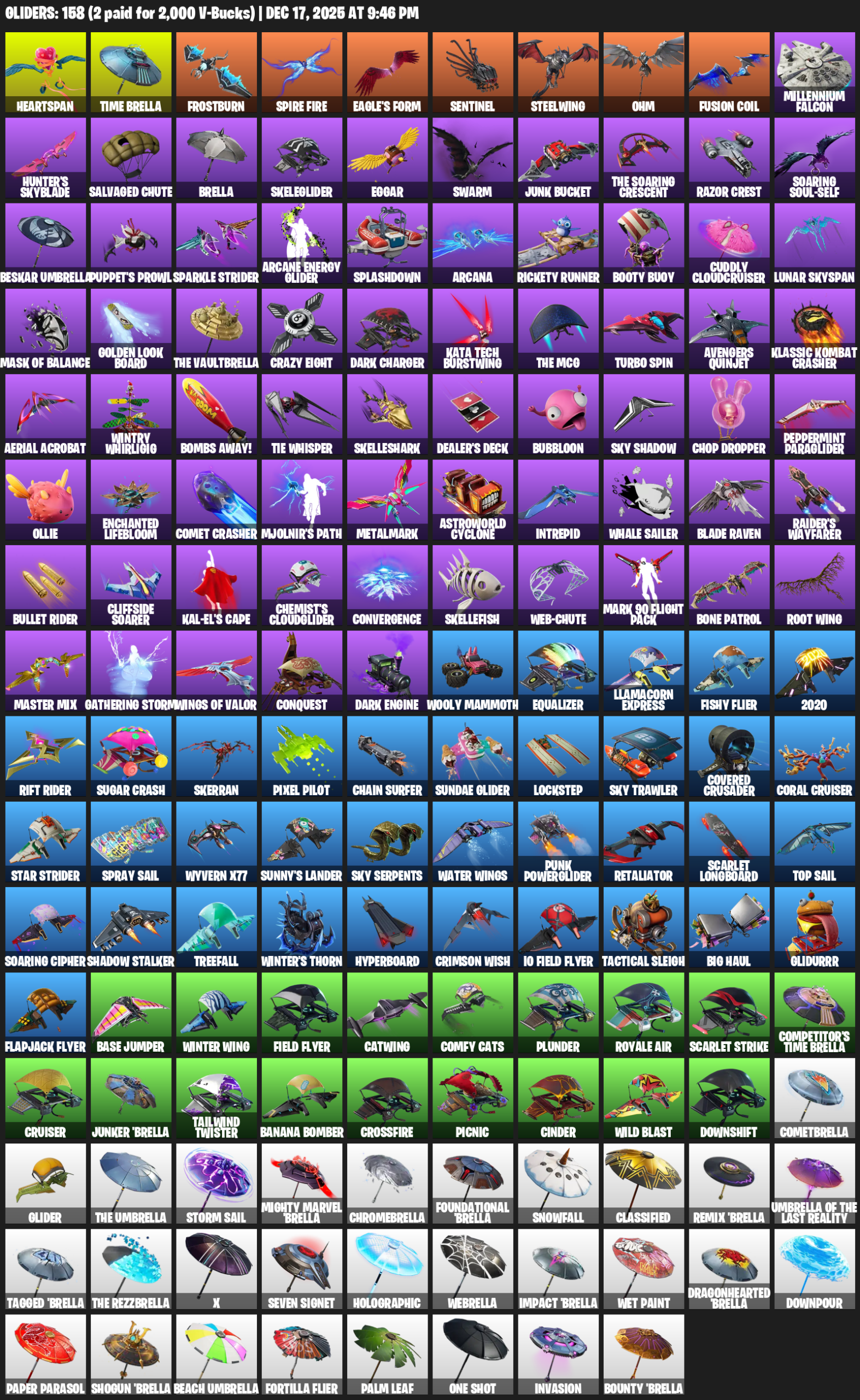 Heartspan, Time Brella, Frostburn, Spire Fire, Eagle’s Form, Steelwing, Ohm, Fusion Coil, Millennium Falcon, Hunter’s Skyblade, Salvaged Chute, Skeleglider, Eggar, Swarm, Junk Bucket, Razor Crest, Soaring Soul-Self