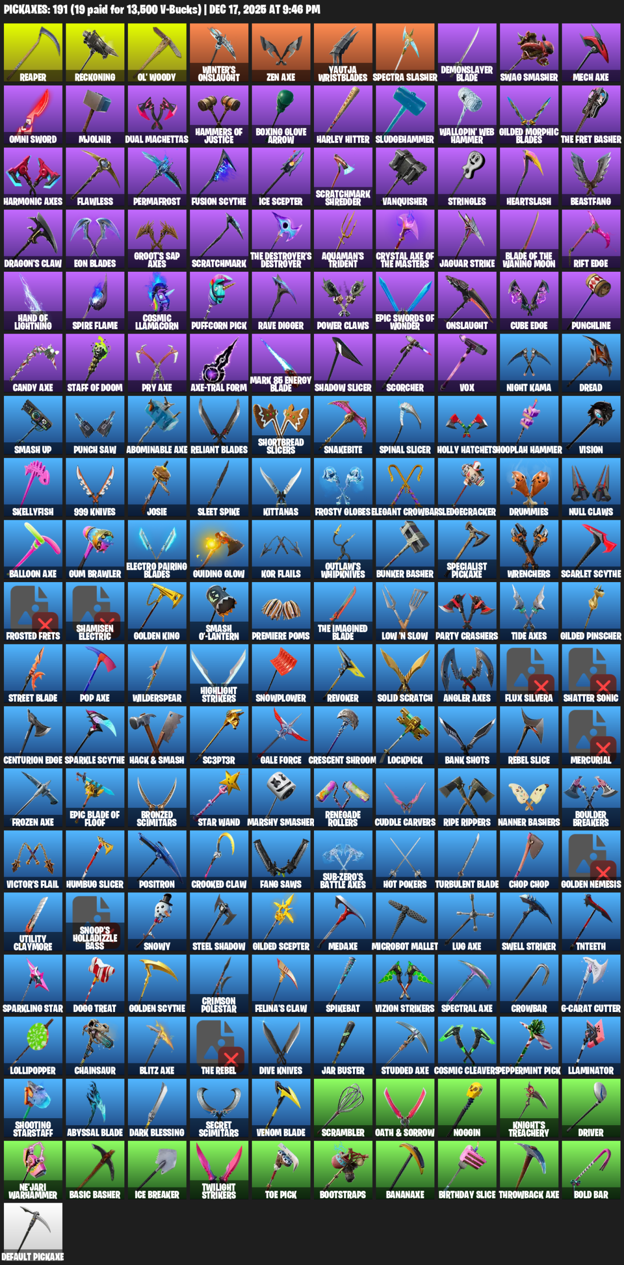 Reaper, Reckoning, Ol’ Woody, Winter’s Onslaught, Zen Axe, Yautja Wristblades, Spectra Slasher, Demonslayer Blade, Swag Smasher, Omni Sword, Mjolnir, Dual Machettas, Hammers of Justice, Boxing Glove Arrow, Harley Hitter, Sludgehammer, Wallopin’ Web Hammer, Gilded Morphic Blades