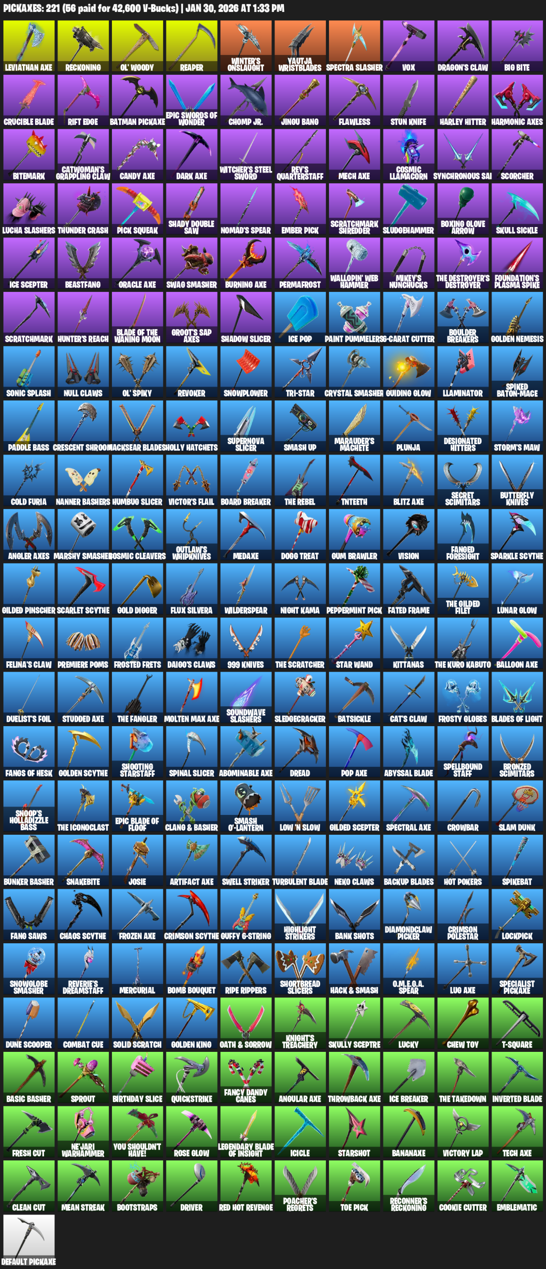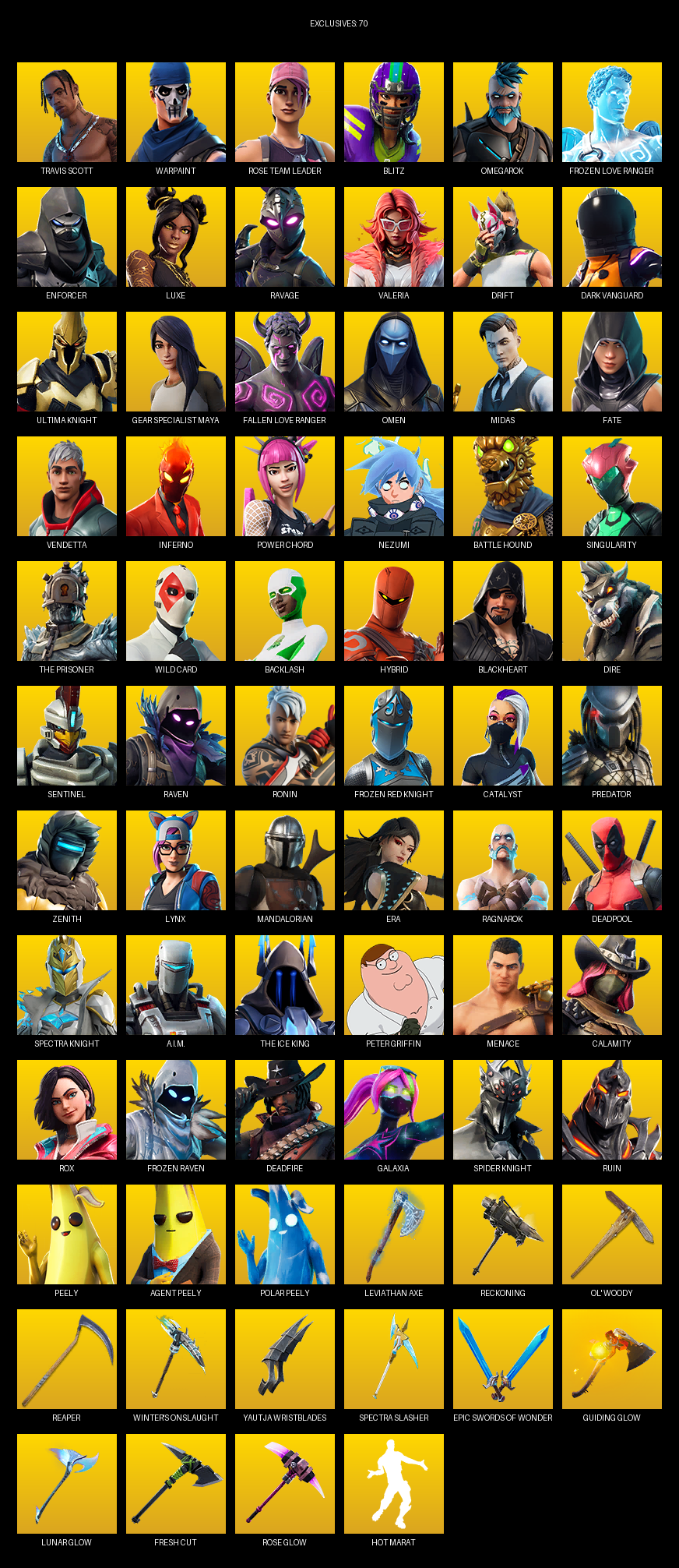 Leviathan Axe, Reckoning, Ol’ Woody, Reaper, Winter’s Onslaught, Yautja Wristblades, Spectra Slasher, Vox, Dragon’s Claw, Big Bite, Crucible Blade, Rift Edge, Batman Pickaxe, Chomp Jr., Jingu Bang, Flawless, Stun Knife, Harley Hitter, Harmonic Axes