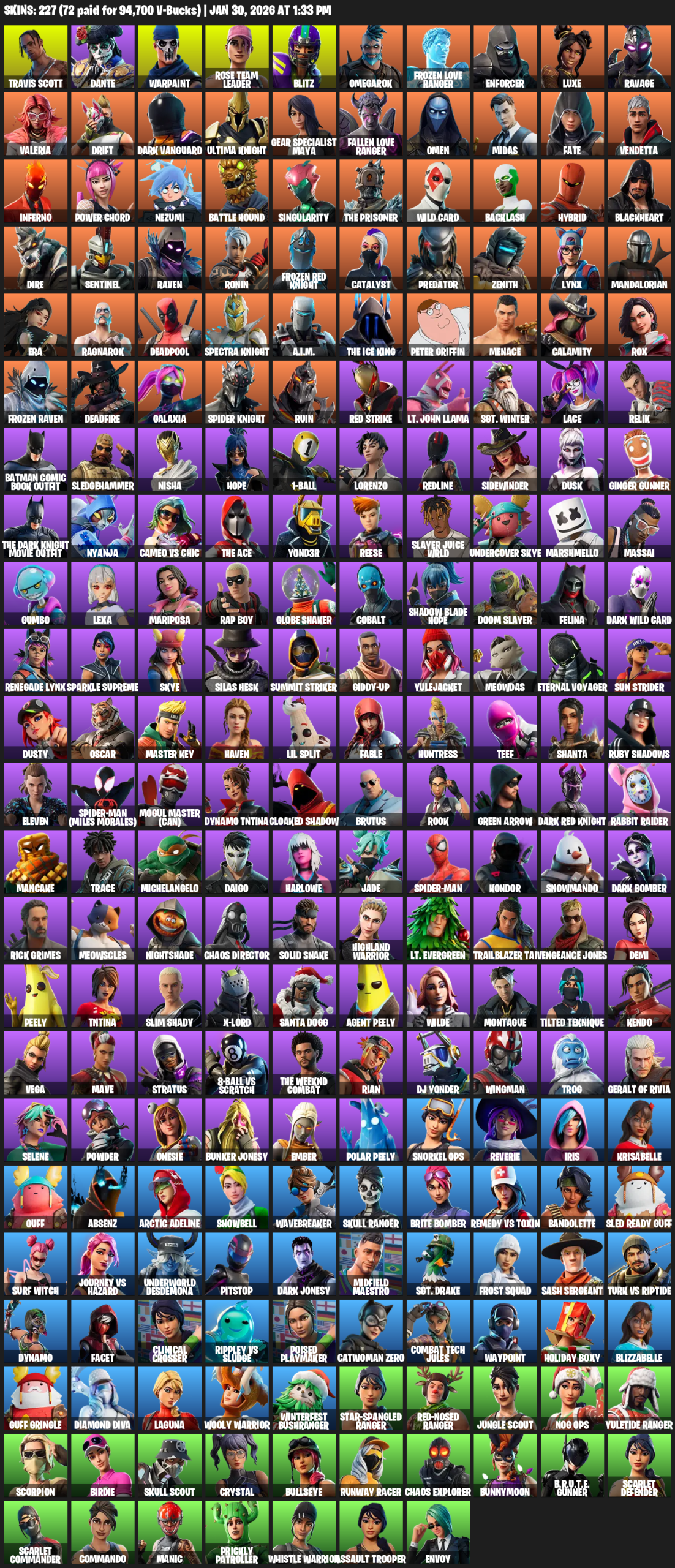 Travis Scott, Gear Specialist Maya, Dante, Warpaint, Rose Team Leader, Blitz, Omegarok, Frozen Love Ranger, Enforcer, Luxe, Ravage, Valeria, Drift, Dark Vanguard, Ultima Knight, Omen, Midas, Fate, Vendetta