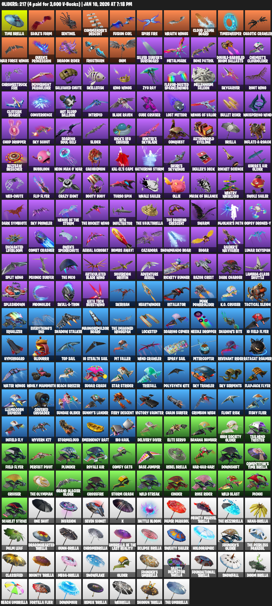 Time Brella, Eagle’s Form, Sentinel, Commander’s Descent, Spire Fire, Wraith Wings, Cloud Llama Board, Timesweeper, Chaotic Crawler, Queen’s Procession, Dragon Rider, Frostburn, Ohm, Silver Surfer’s Surfboard, Metalmark, Bone Patrol, Chemist’s Cloudglider