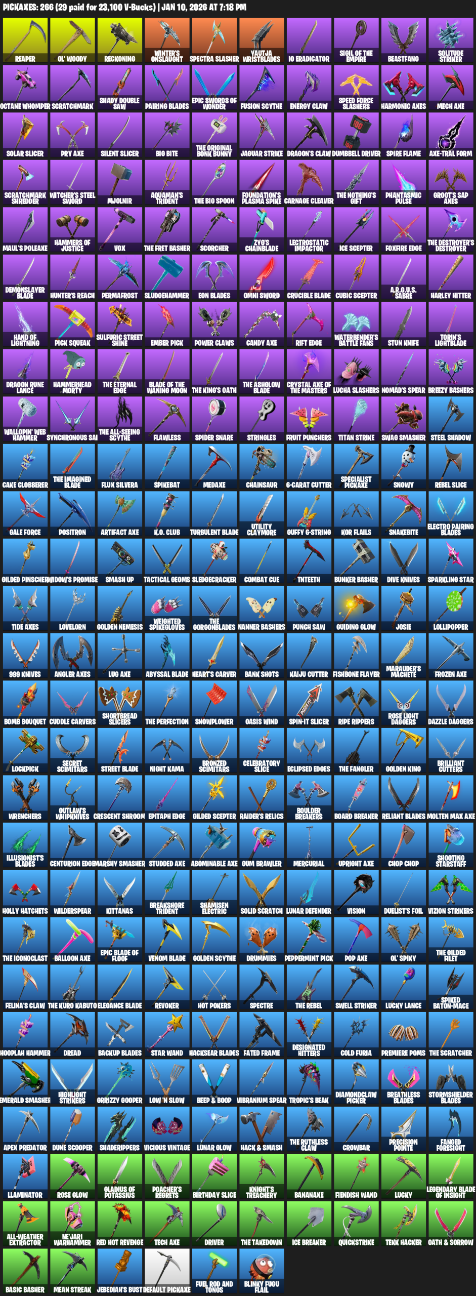 Reaper, Ol’ Woody, Reckoning, Winter’s Onslaught, Yautja Wristblades, IO Eradicator, Beastfang, Solitude Striker, Octane Whomper, Scratchmark, Shady Double Saw, Pairing Blades, Fusion Scythe, Energy Claw, Speed Force Slashers, Harmonic Axes, Mech Axe