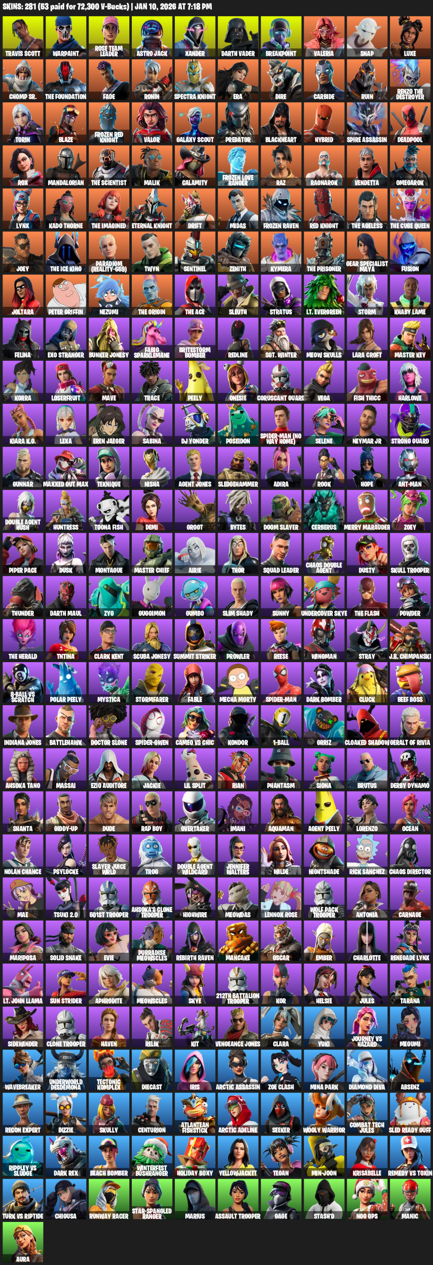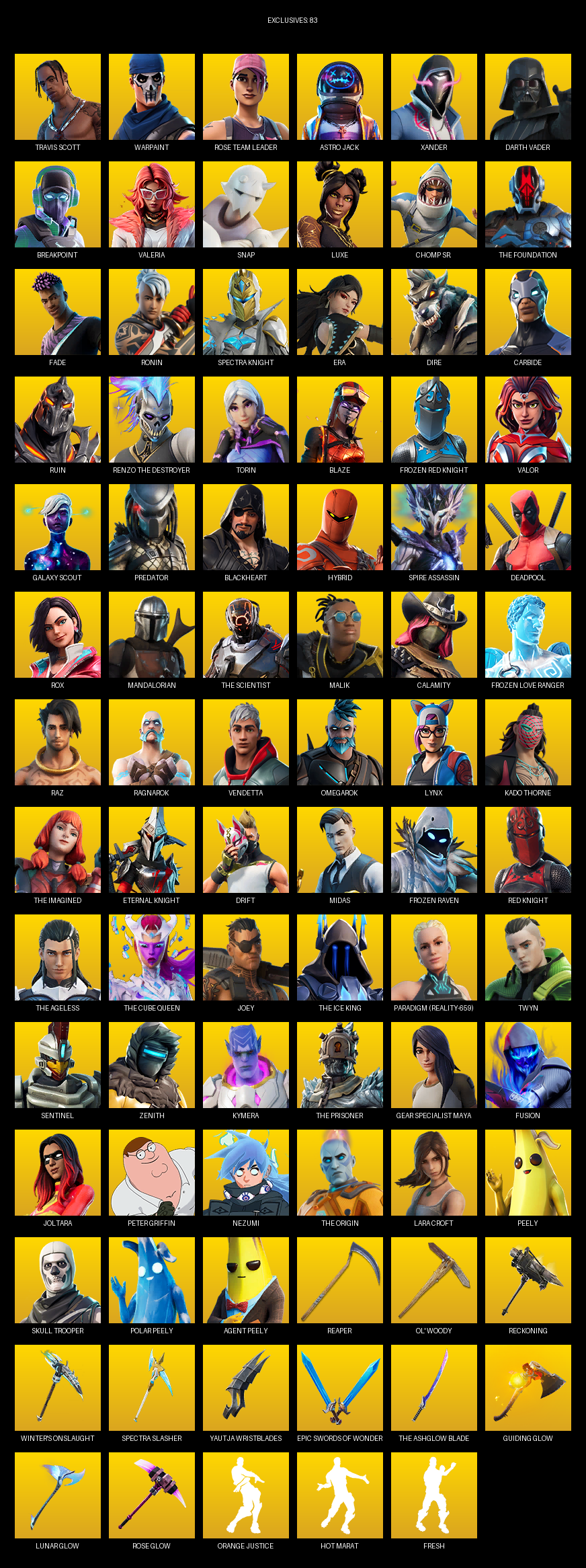 Travis Scott, Gear Specialist Maya, Lara Croft, Warpaint, Rose Team Leader, Astro Jack, Xander, Darth Vader, Breakpoint, Valeria, Snap, Luxe, Chomp Sr., The Foundation, Fade, Ronin, Spectra Knight, Era, Dire, Carbide