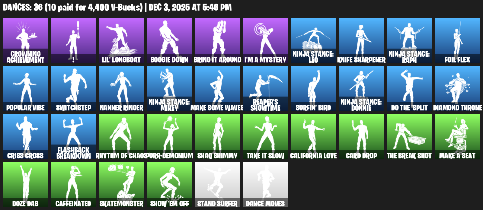 Crowning Achievement, !, Lil’ Longboat, Boogie Down, Bring it around, I’m a Mystery, Ninja Stance: Leo, Popular Vibe, Switchstep, Make Some Waves, Reaper’s Showtime, Surfin’ Bird, Diamond Throne