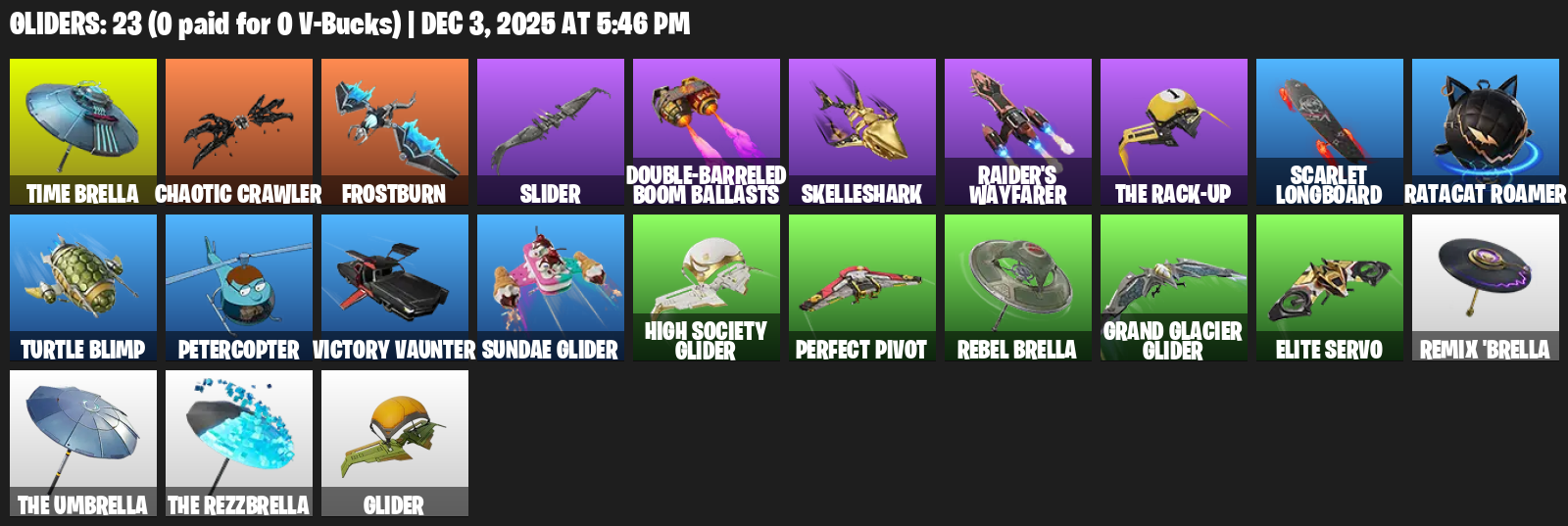 Time Brella, Chaotic Crawler, Frostburn, Slider, Double-Barreled Boom Ballasts, Skelleshark, Raider’s Wayfarer, Scarlet Longboard, Ratacat Roamer, Turtle Blimp, Petercopter, Victory Vaunter, Sundae Glider, Perfect Pivot, Elite Servo, Remix ‘Brella