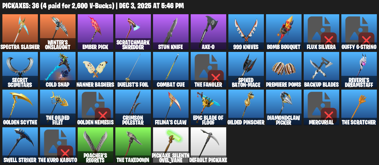 Winter’s Onslaught, Ember Pick, Scratchmark Shredder, Stun Knife, aXe-O, 999 Knives, Bomb Bouquet, Flux Silvera, Guffy 6-String, Secret Scimitars, Cold Snap, Nanner Bashers, Duelist’s Foil, Combat Cue, The Fangler, Spiked Baton-Mace, Premiere Poms, Backup Blades, Reverie’s Dreamstaff