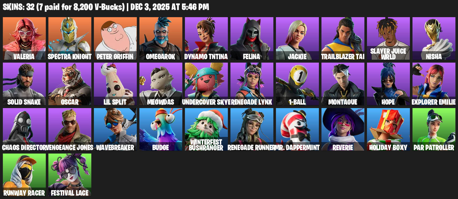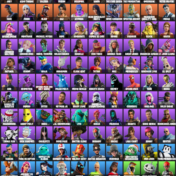Valeria, Spectra Knight, Peter Griffin, Omegarok, Dynamo TNTina, Felina, Jackie, Trailblazer Tai, Slayer Juice WRLD, Nisha, Solid Snake, Oscar, Lil Split, Meowdas, Undercover Skye, Renegade Lynx, 1-Ball, Montague, Hope, Explorer Emilie
