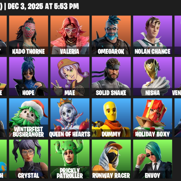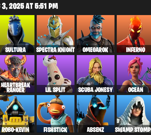 Spectra Knight, Peter Griffin, Zeus, Omegarok, Valeria, Vengeance Jones, Godzilla Evolved, Oscar, Aphrodite, Fish Thicc, Shadow Blade Hope, Cerberus, Piper Pace, Artemis, Yulejacket, Polar Peely, Nisha, Astrea, Slayer Juice WRLD, Lil Split