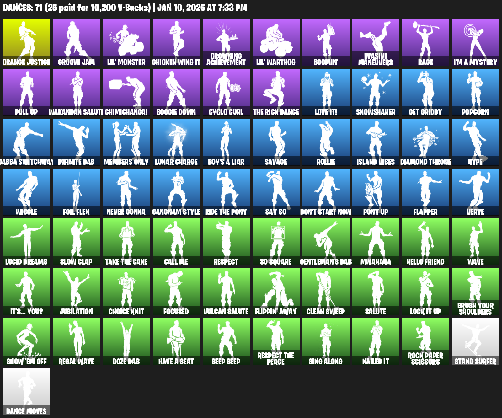 Orange Justice, Groove Jam, Lil’ Monster, Chicken Wing It, Crowning Achievement, Boomin’, Evasive Maneuvers, Rage, I’m a Mystery, Pull Up, Wakandan Salute, Chimichanga!, Boogie Down, Cyclo Curl, Love it!, Snowshaker, Get Griddy, Popcorn